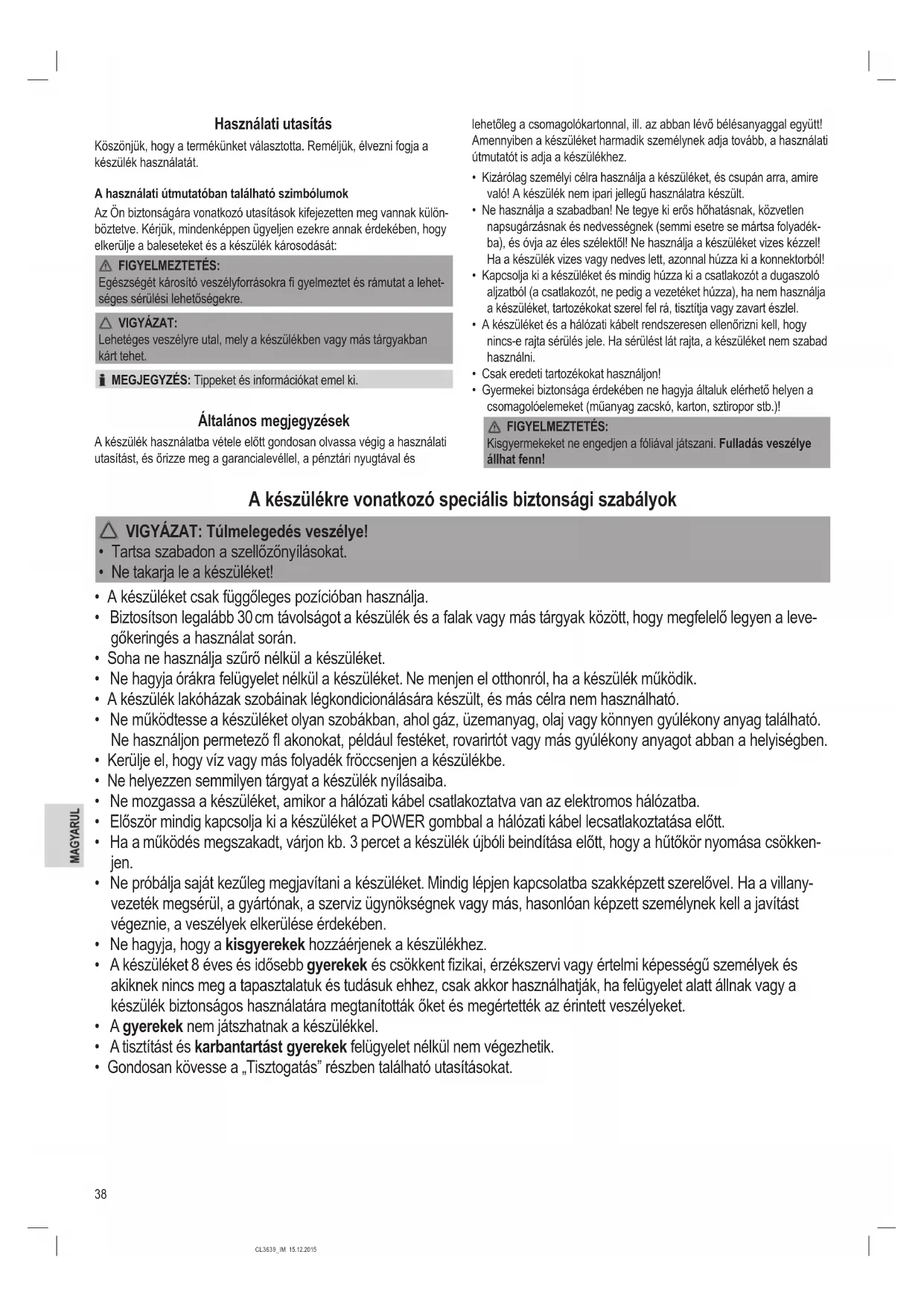 • Ne hagyja órákra felügyelet nélkül a készüléket. Ne menjen el otthonról, ha a készülék működik.