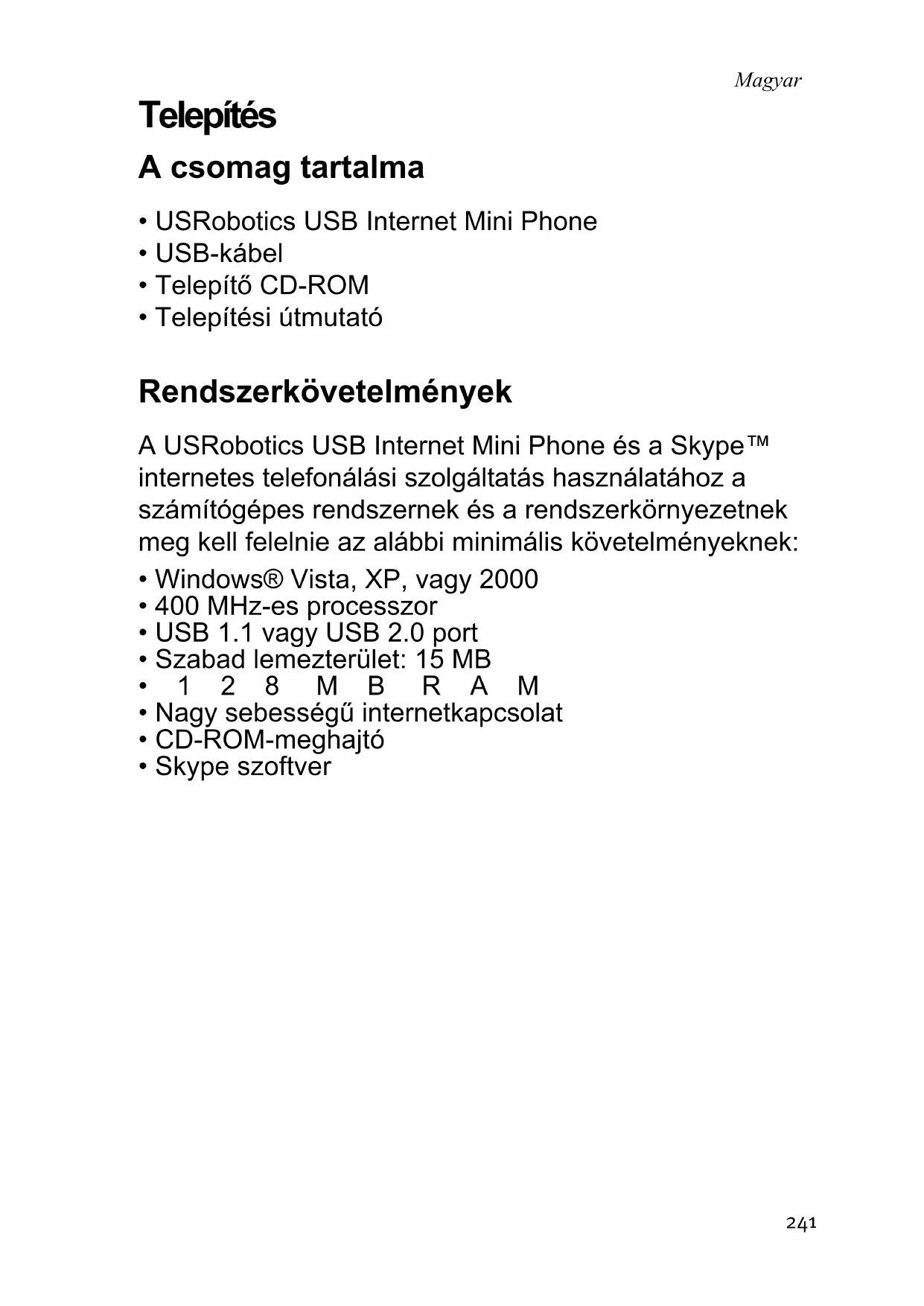 - Telepítési útmutató Rendszerkövetelmények A USRobotics USB Internet Mini Phone és a Skype™ internetes telefonálási szolgáltatás használatához a számítógépes rendszernek és a rendszerkörnyezetnek meg kell felelnie az alábbi minimális követelményeknek: