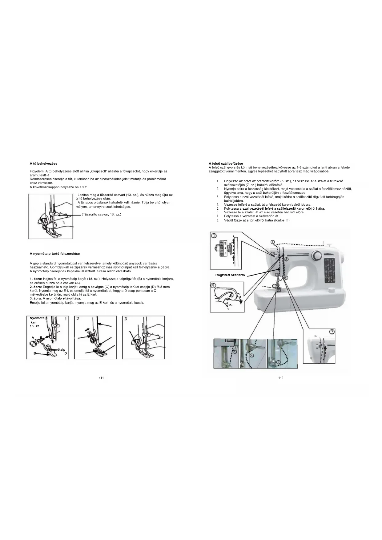 Be/ki kapcsoló111 A tű behelyezése Figyelem: A tű behelyezése előtt állítsa „kikapcsolt” állásba a főkapcsolót, hogy elkerülje az áramütést!~! Rendszeresen cserélje a tűt, különösen ha az elhasználódás jeleit mutatja és problémákat okoz varráskor. A következőképpen helyezze be a tűt: Lazítsa meg a tűszorító csavart (13. sz.), és húzza meg újra az új tű behelyezése után. A tű lapos oldalának hátrafelé kell néznie. Tolja be a tűt olyan mélyen, amennyire csak lehetséges. (Tűszorító csavar, 13. sz.)