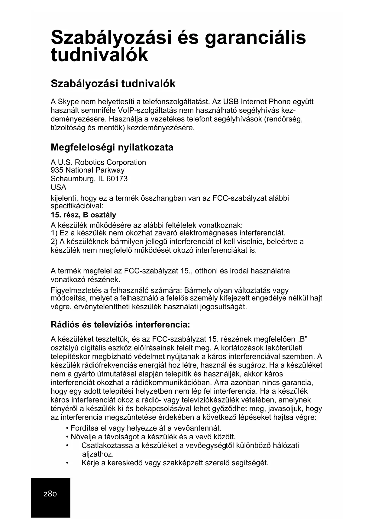 Tato omezená záruka se řídí právem státu Illinois, USA, s výjimkou konfliktů právních principů a konvence OSN o smlouvách pro mezinárodní prodej zboží. U.S. Robotics Corporation 935 National Parkway Schaumburg, IL, 60173 U.S.A.280 Szabályozási és garanciális tudnivalók Szabályozási tudnivalók A Skype nem helyettesíti a telefonszolgáltatást. Az USB Internet Phone együtt használt semmiféle VoIP-szolgáltatás nem használható segélyhívás kez- deményezésére. Használja a vezetékes telefont segélyhívások (rendőrség, tűzoltóság és mentők) kezdeményezésére. Megfeleloségi nyilatkozata A U.S. Robotics Corporation 935 National Parkway Schaumburg, IL 60173 USA kijelenti, hogy ez a termék összhangban van az FCC-szabályzat alábbi specifikációival: