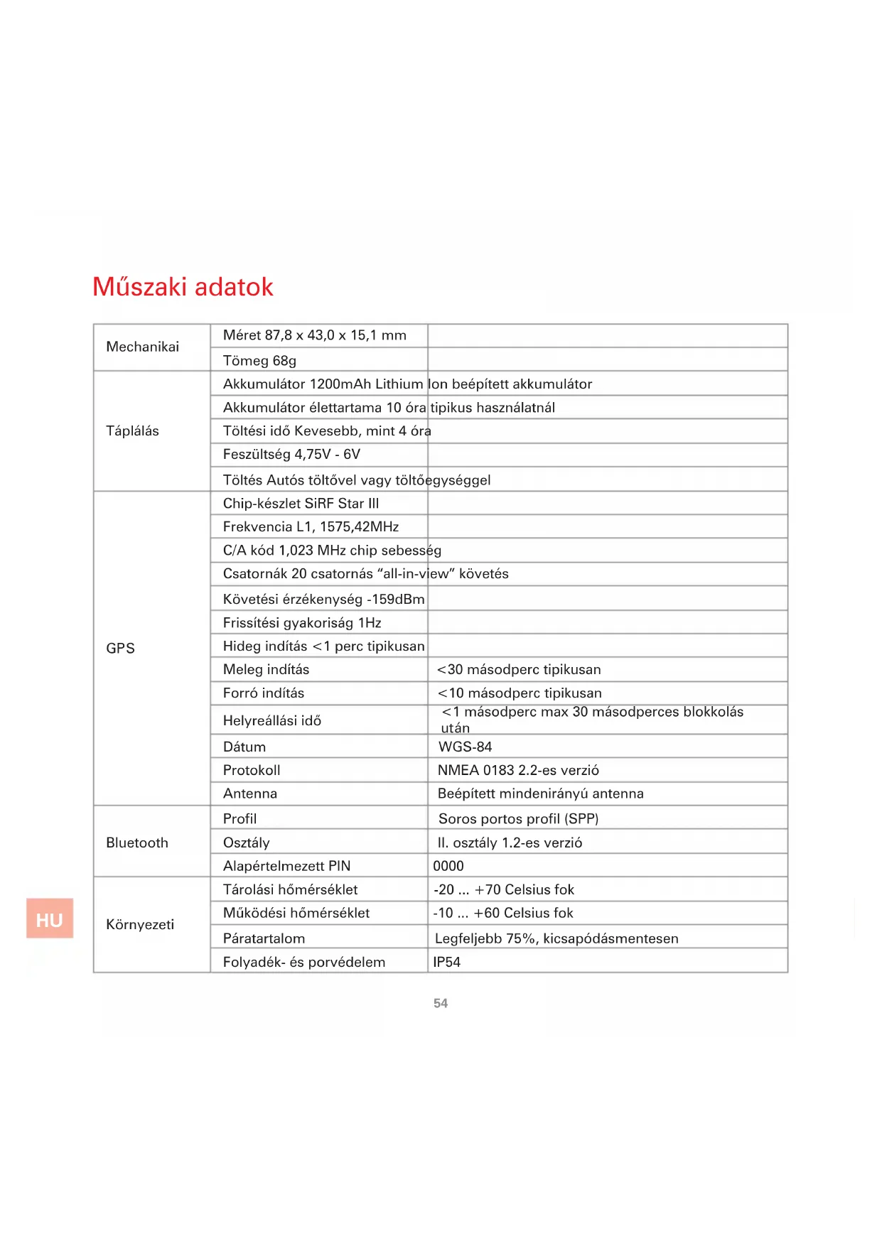 Mechanikai Méret 87,8 x 43,0 x 15,1 mm Tömeg 68g Táplálás Akkumulátor 1200mAh Lithium Ion beépített akkumulátor Akkumulátor élettartama 10 óra tipikus használatnál Töltési idő Kevesebb, mint 4 óra Feszültség 4,75V - 6V Töltés Autós töltővel vagy töltőegységgel GPS Chip-készlet SiRF Star III Frekvencia L1, 1575,42MHz C/A kód 1,023 MHz chip sebesség Csatornák 20 csatornás “all-in-view” követés Követési érzékenység -159dBm Frissítési gyakoriság 1Hz Hideg indítás <1 perc tipikusan Meleg indítás <30 másodperc tipikusan Forró indítás <10 másodperc tipikusan Helyreállási idő <1 másodperc max 30 másodperces blokkolás után Dátum WGS-84 Protokoll NMEA 0183 2.2-es verzió Antenna Beépített mindenirányú antenna Bluetooth Prol Soros portos prol (SPP) Osztály II. osztály 1.2-es verzió Alapértelmezett PIN 0000 Környezeti Tárolási hőmérséklet -20 ... +70 Celsius fok Működési hőmérséklet -10 ... +60 Celsius fok Páratartalom Legfeljebb 75%, kicsapódásmentesen Folyadék- és porvédelem IP54 Műszaki adatok54
