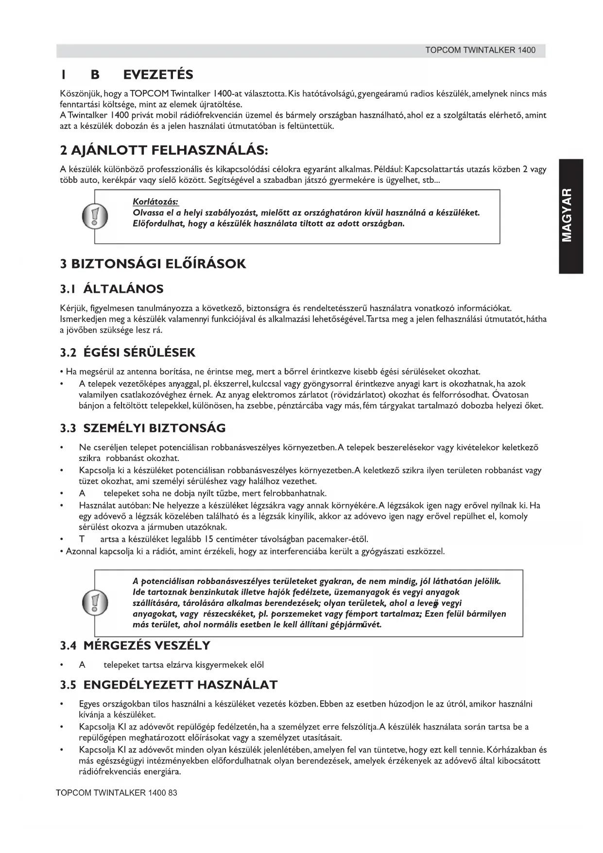 Pođkození nebo vady, které vznikly đpatným zacházením nebo obsluhou a vady vzniklé pouĹitím neoriginálních ćástí nebo doplňků, které nejsou doporućeny Topcomem nejsou zárukou pokryty Bezdrátové telefony spolećnosti Topcom musí být pouĹívány výhradně s dobíjecími bateriemi. Na vady způsobené pouĹíváním jednorázových baterií se záruka nevztahuje Záruka se nevztahuje na vady způsobené vnějđími faktory, jako jsou blesky, voda a oheň, ani na vady vzniklé během přepravy Záruku nelze vymáhat, pokud bylo sériové ćíslo na přístroji změněno, odstraněno nebo se stalo nećitelným. Nárok na záruku je neplatný i v případě, Ĺe byl přístroj opravován, změněn nebo upraven uĹivatelem nebo servisním centrem, které nebylo Topcomem autorizováno. Vlastnosti popsané v této příručce jsou publikovány s vyhrazeným právem na změnu.TOPCOM TWINTALKER 1400 83 TOPCOM TWINTALKER 1400 MAGYAR 1BEVEZETÉS Köszönjük, hogy a TOPCOM Twintalker 1400-at választotta. Kis hatótávolságú, gyengeáramú radios készülék, amelynek nincs más fenntartási költsége, mint az elemek újratöltése. A Twintalker 1400 privát mobil rádiófrekvencián üzemel és bármely országban használható, ahol ez a szolgáltatás elérhető, amint azt a készülék dobozán és a jelen használati útmutatóban is feltüntettük. 2 AJÁNLOTT FELHASZNÁLÁS: A készülék különböző professzionális és kikapcsolódási célokra egyaránt alkalmas. Például: Kapcsolattartás utazás közben 2 vagy több auto, kerékpár vaqy síelő között. Segítségével a szabadban játszó gyermekére is ügyelhet, stb... 3 BIZTONSÁGI ELőÍRÁSOK