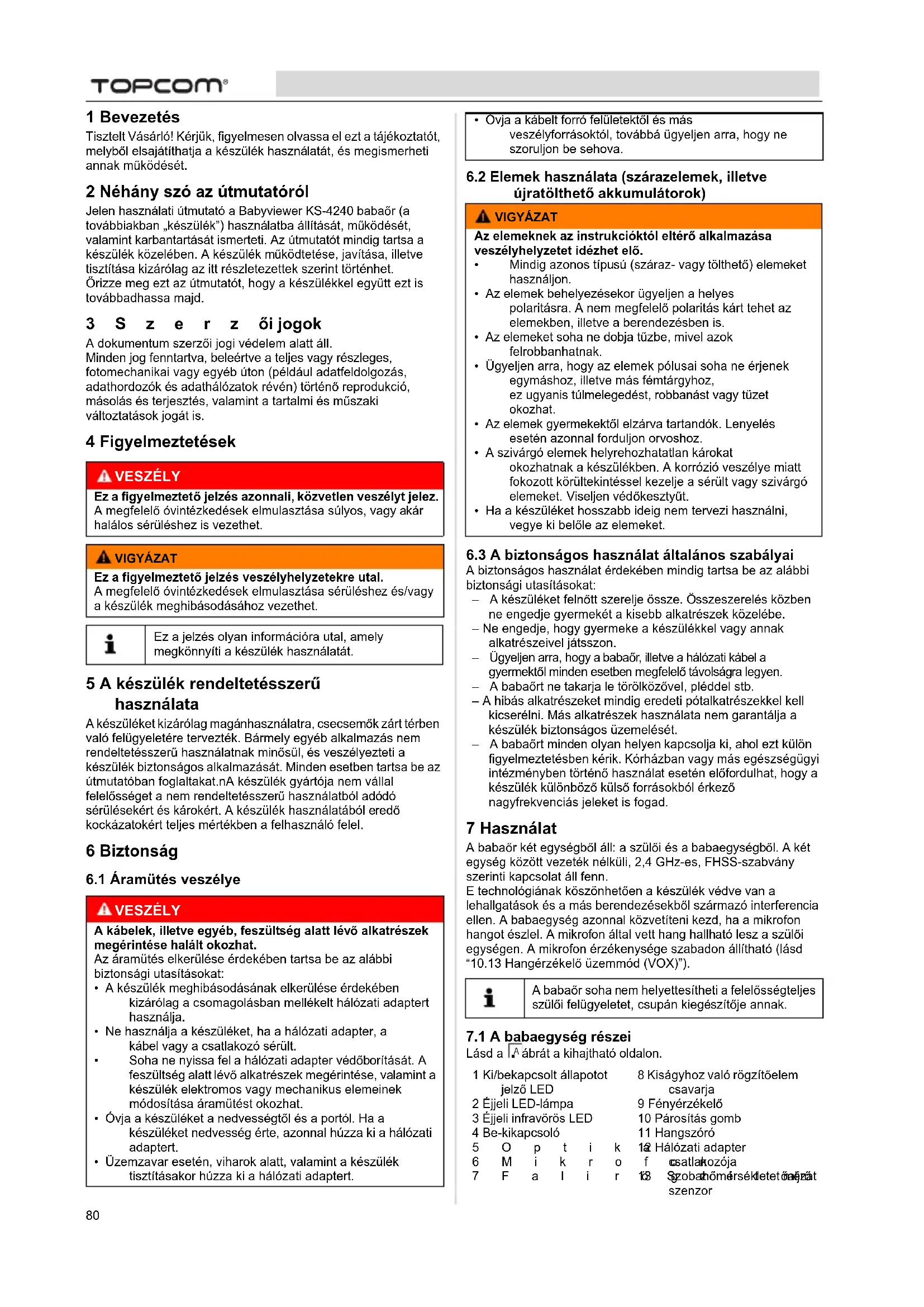 1 Bevezetés Tisztelt Vásárló! Kérjük, figyelmesen olvassa el ezt a tájékoztatót, melyből elsajátíthatja a készülék használatát, és megismerheti annak működését. 2 Néhány szó az útmutatóról Jelen használati útmutató a Babyviewer KS-4240 babaőr (a továbbiakban „készülék”) használatba állítását, működését, valamint karbantartását ismerteti. Az útmutatót mindig tartsa a készülék közelében. A készülék működtetése, javítása, illetve tisztítása kizárólag az itt részletezettek szerint történhet. Őrizze meg ezt az útmutatót, hogy a készülékkel együtt ezt is továbbadhassa majd. 3Szerzői jogok A dokumentum szerzői jogi védelem alatt áll.Minden jog fenntartva, beleértve a teljes vagy részleges, fotomechanikai vagy egyéb úton (például adatfeldolgozás, adathordozók és adathálózatok révén) történő reprodukció, másolás és terjesztés, valamint a tartalmi és műszaki változtatások jogát is. 4 Figyelmeztetések 5 A készülék rendeltetésszerű használata A készüléket kizárólag magánhasználatra, csecsemők zárt térben való felügyeletére tervezték. Bármely egyéb alkalmazás nem rendeltetésszerű használatnak minősül, és veszélyezteti a készülék biztonságos alkalmazását. Minden esetben tartsa be az útmutatóban foglaltakat.nA készülék gyártója nem vállal felelősséget a nem rendeltetésszerű használatból adódó sérülésekért és károkért. A készülék használatából eredő kockázatokért teljes mértékben a felhasználó felel. 6 Biztonság