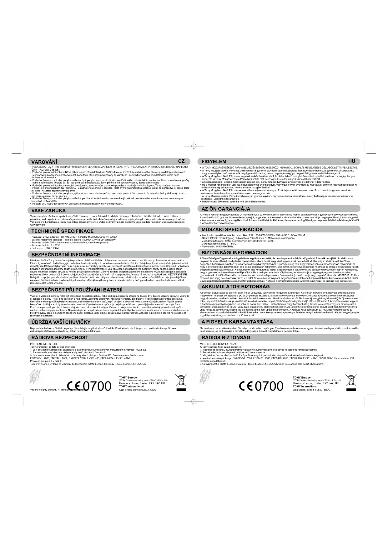 Az elemek eltávolítását és cseréjét csak felnőtt végezheti, vagy felnőtt felügyelete szükséges. Különösen figyeljen arra, hogy az akkumulátorokat megfelelően helyezze be, figyelve a (+) és (-) polaritás jelzésre az akkumulátorokon és a termékben. Ne zárja rövidre az akkumulátor rekeszben vagy aljzatokban található csatlakozásokat. A lemerült akkumulátort távolítsa el a termékből. Ne használjon együtt régi (használt) és új akkumuláto- rokat, vagy különböző típusú, pl. újratölthető és alkáli elemeket, vagy különböző gyártmányú/márkájú akkumulátorokat. A lemerült elemeket vigye el a hivatalos gyűjtőhelyek egyikébe, és soha ne dobja őket tűzbe. Használat után, vagy hosszabb ideig tartó tárolás esetén vegye ki az elemeket a termékből. Csak az ajánlott típusú, vagy azzal egyenértékű elemeket használjon. Az újratölthető akkumulátorok eltávolítását csak felnőtt végezheti, vagy felnőtt felügyelete szükséges. Ne próbálja tölteni a nem újratölthető elemeket. A kerekes kuka szimbólum azt jelzi, hogy a terméket és az elemeket nem szabad a háztartási hulladék közé rakni, mivel környezetre és egészségre ártalmas anygokat tartalmazhatnak. Kérjük, vegye igénybe a gyűjtőpontokat vagy az újrahasznosító telepeket. Ne merítse vízbe az alkatrészeket. Ne helyezze közvetlen napfényre. Rendszeresen ellenőrizze az egyes részeket esetleges elektromos károsodás jeleit keresve, és ne használja a terméket addig, míg a hibákat megfelelően ki nem javították. MEGFELELŐSÉGI NYILATKOZATA Tomy elismeri, hogy ez a babafigyelő:1. Megfelel az 1995/5/C Európai Irányelv alapvető követelményeinek és egyéb kapcsolódó rendelkezéseinek.2. Tesztelve lett minden alapvető rádiótesztelő berendezésre.3. Megfelel az összes alkalmazható Európai Bizottsági Irányelv minden alapvetően alkalmazható követelményének; az említett szabványok listája: EN60950-1: 2006, EN62471: 2008, EN62479: 2010, EN301 406, EN301 489-1, EN301 489-6. Használata az EU területén engedélyezett. Ez a nyilatkozat a TOMY Europe, Hembury House, Exeter, EX2 5AZ, UK teljes felelőssége alatt került kibocsátásra. A Tomy Babafigyelőt gyermeke felügyeletének segítésére tervezték, és nem helyettesíti a felnőtt felügyeletet. A termék nem játék. Az elektromos dolgokat és azok kábeleit mindig tartsa olyan helyen, ahol a babák vagy kisebb gyermekek nem érhetik el. Semmilyen körülmények között ne helyezze a babafigyelő egyetlen darabját sem a kiságyba vagy kiságyra. Győződjön meg róla, hogy minden vezeték biztonságosan helyezkedik el, hogy a gyermekek ne gabalyodjanak bele és ne keletkezzen kóboráram. Semmilyen körülmények között ne használja az ehhez a készülékhez kapott adaptereket más készülékekkel. Ne használjon más készülékhez kapott adaptert ezzel a készülékkel. Az adapter elhelyezésekor legyen körültekintő, hogy a gyermek ne használhassa azt lépcsőként. Ha a bedugott adapterre súlyt helyez, az károsíthatja az egységet vagy sérüléseket okozhat gyermekének. A töltőknél normális, ha használat közben felmelegszenek – óvatosan bánjon velük, várja meg, míg a hő eltávozik. NE FEDJE LE. Ha a terméket több napig nem használja, húzza ki a töltőt. Az áramütés veszélyének megelőzésének érdekében tisztítás előtt húzza ki az áramforrásból. A Szülői Egységben található újratölthető akkumulátor újrahasznosítható. Ne tegye a normál hulladék közé. A termék egyik részét se próbálja meg szétszerelni.