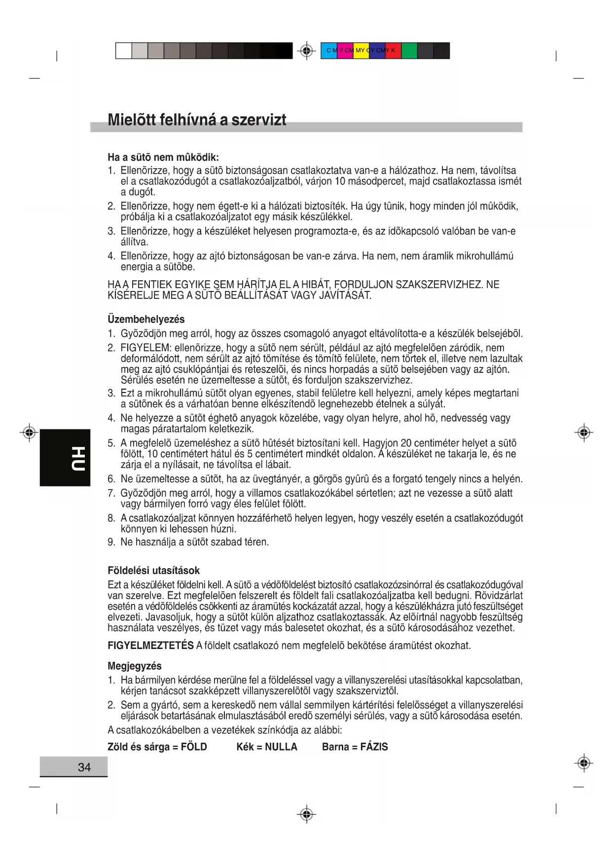 eljárások betartásának elmulasztásából eredõ személyi sérülés, vagy a sütõ károsodása esetén. A csatlakozókábelben a vezetékek színkódja az alábbi: Zöld és sárga = FÖLD Kék = NULLA Barna = FÁZISC M Y CM MY CY CMY K