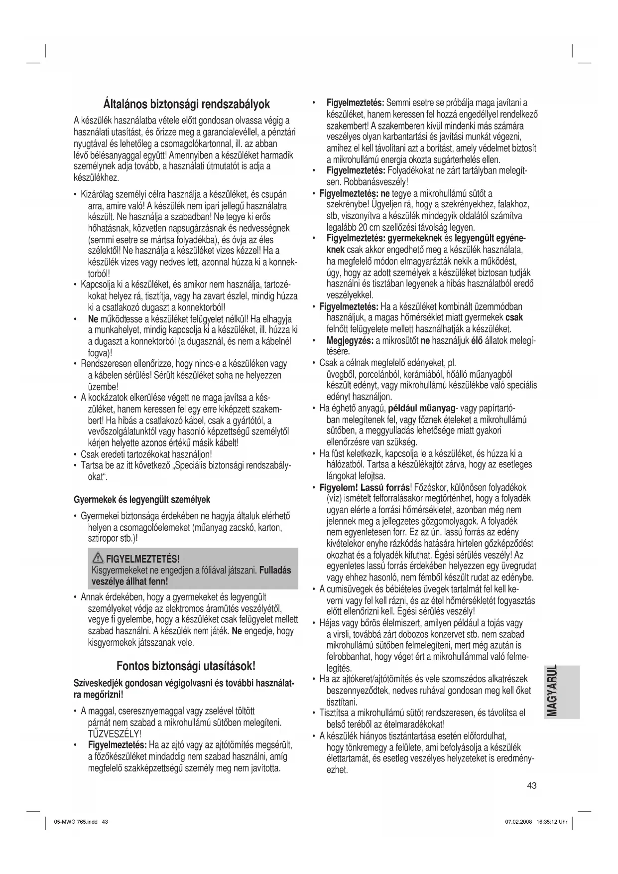 - A készülék hiányos tisztántartása esetén előfordulhat, hogy tönkremegy a felülete, ami befolyásolja a készülék élettartamát, és esetleg veszélyes helyzeteket is eredmény- ezhet. 05-MWG 765.indd 4305-MWG 765.indd 43 07.02.2008 16:35:12 Uhr07.02.2008 16:35:12 Uhr44 MAGYARUL MAGYARUL