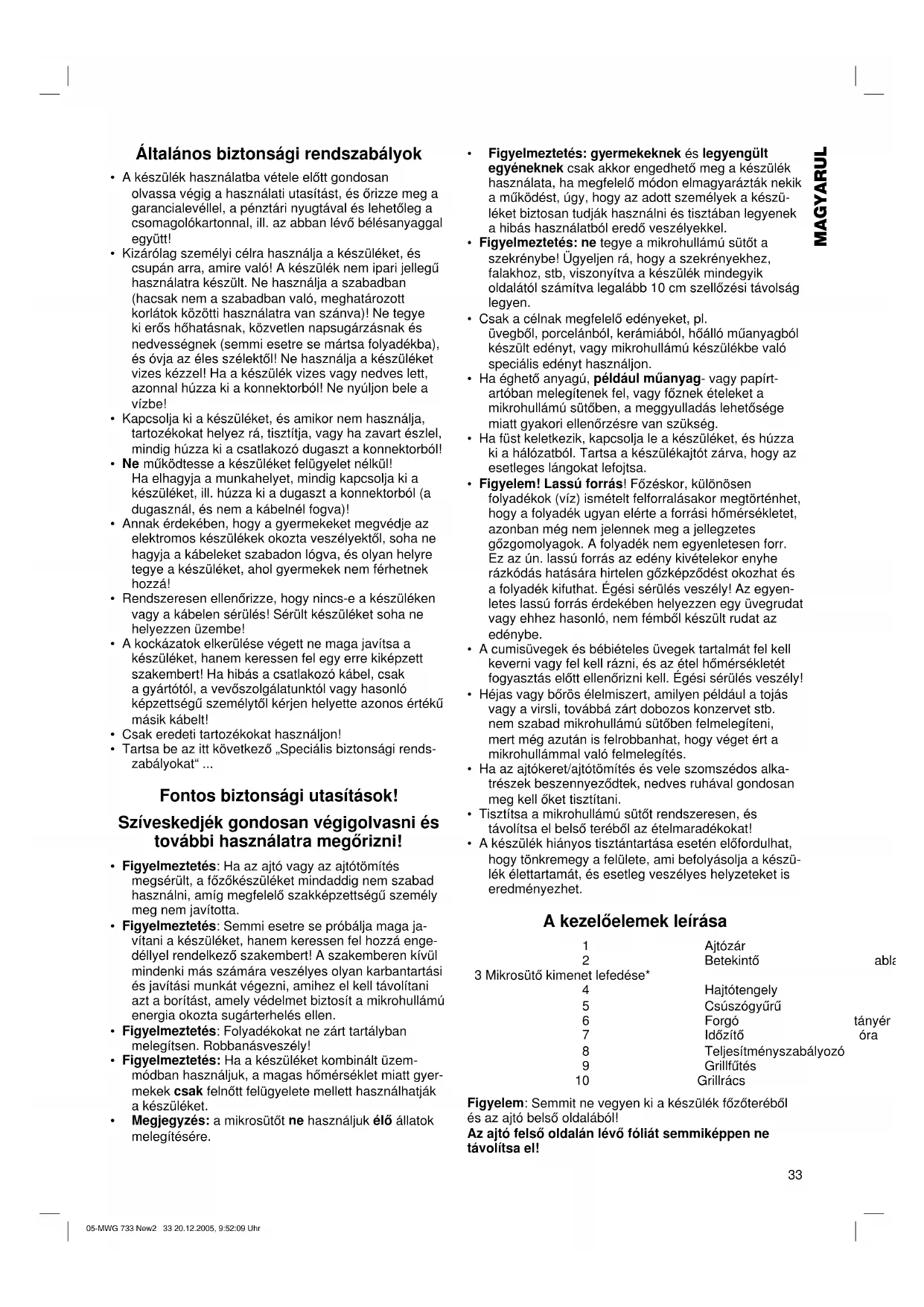 - Az ajtókeretet/ajtótömítéseket és a szomszédos részeket szennyeződés esetén gondosan meg kell tisztítani nedves ruhával. Műszaki adatok Modell: .............................................................. MWG 733 Feszültségellátás:..................................230–240 V, 50 Hz Teljesítményfelvétel: mikrohullám: ....................................................1200 W grill: ..................................................................1000 W Méretezési teljesítmény/ Mikrosütő kimeneti teljesítménye:............................800 W Párolási/főzési térfogat:...........................................20 liter Védelmi osztály:................................................................ Ι Ezt a készüléket az Európa Tanács minden vonatkozó aktuális irányelve szerint (pl. elektromágnesesség- elviselő képesség vagy kisfeszültség-elviselő képesség) ellenőriztük, és a legújabb biztonságtechnikai előírások szerint készült. Megjegyezzük az esetleges müszaki változásokat! Garancia Garanciális igényeivel forduljon, kérem, a szerződéses kereskedőjéhez! A garancia igazolására a pénztári nyugta szolgál. E nél- kül az igazolás nélkül sem díjmentes csere, sem díjtalan javítás nem végezhető. Garanciális esetben eredeti csomagolásában adja át az alapkészüléket a pénztári bizonylattal együtt annak a kereskedőnek, akitől a készüléket vásárolta! *) A tartozékok hibái nem eredményezik automatikusan az egész készülék díjtalan cseréjét. Ilyen esetekben forduljon „forró vonalunkhoz”! Az üvegtörésből, ill. a műanyag alkatrészek töréséből eredő hibák megszünte- tése mindenkor térítésköteles. Sem az elhasználódó tartozékokban, ill. kopó alka- trészekben (pl. szénkefe, dagasztóhorog, hajtószíj, póttávvezérlő, pótfogkefe, fűrészlap stb.) bekövetkező hibák, sem a tisztítás, karbantartás vagy a kopó alkatrés- zek cseréje nem esik a garancia hatálya alá, következés- képp térítésköteles. Illetéktelen beavatkozás a garancia megszűnését ered- ményezi. A garanciális idő után A garanciális idő eltelte után a megfelelő szakkereske- désben vagy javítószolgálatnál végeztethet térítésköteles javításokat. A „kuka“ piktogram jelentése Kímélje környezetünket, az elektromos készülékek nem a háztartási szemétbe valók! Használja az elektromos készülékek ártalmatlanítására kijelölt gyűjtőhelyeket, ott adja le azokat az elektromos készülékeit, amelyeket többé már nem kíván használni! Ezzel segítséget nyújt ahhoz, hogy elkerülhetők legyenek azok a hatások, amelyeket a helytelen „szemétre dobás“ gyakorolhat a környezetre és az emberi egészségre. Ezzel hozzájárul az újrahasznosításhoz, a recyclinghoz és a kiöregedett elektromos és elektronikus készülékek értékesítésének egyéb formáihoz. Az önkormányzatoknál vagy a polgármesteri hivatalokban tájékoztatást kaphat arról, hogy hova viheti a kiselejtezett készülékeket Az EU sok országában már 2005. augusztus 13-ától kezdve tilos a kiöregedett elektromos és elektronikus készülékeket a háztartási szemétbe dobni. Németországban 2006. márciustól 23-ától. 05-MWG 733 New2 35 20.12.2005, 9:52:11 Uhr36