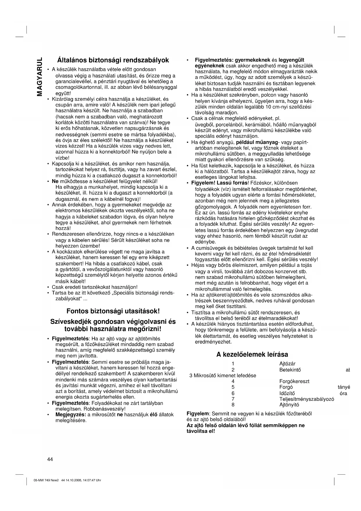 - A készülék hiányos tisztántartása esetén előfordulhat, hogy tönkremegy a felülete, ami befolyásolja a készü- lék élettartamát, és esetleg veszélyes helyzeteket is eredményezhet. A kezelőelemek leírása 1 Ajtózár 2 Betekintő ablak 3 Mikrosütő kimenet lefedése 4 Forgókereszt 5 Forgó tányér 6 Időzítő óra 7 Teljesítményszabályozó 8 Ajtónyitó Figyelem: Semmit ne vegyen ki a készülék főzőteréből és az ajtó belső oldalából! Az ajtó felső oldalán lévő fóliát semmiképpen ne távolítsa el! 05-MW 749 New2 44 14.10.2005, 14:07:47 Uhr45 MAGYARUL Üzembe helyezés
