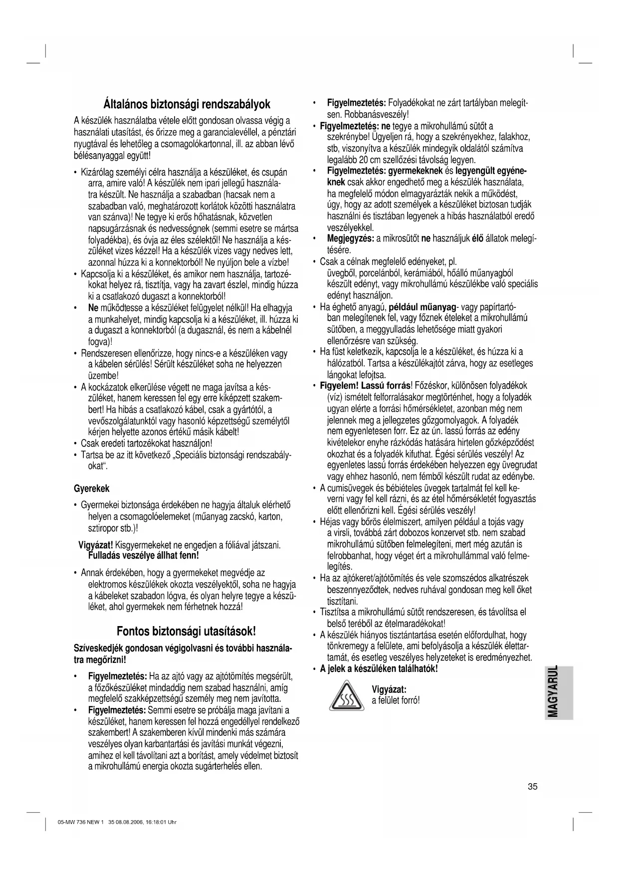 - A ház külső oldalát csak nedves kendővel tisztítsa. Ügyeljen arra, hogy ne kerüljön víz a ház nyílásaiba, nehogy befoly- jon a nedvesség a ház belsejébe. 05-MW 736 NEW 1 36 08.08.2006, 16:18:04 UhrMAGYARUL