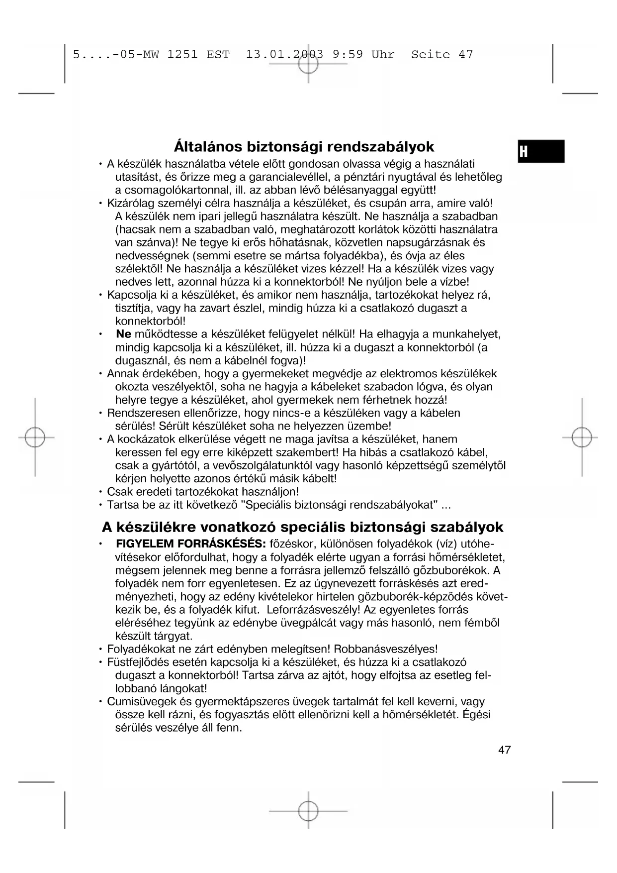 5....-05-MW 1251 EST 13.01.2003 9:59 Uhr Seite 48• A mikrohullámú sütő nem helyettesíti a hagyományos tűzhelyet. Főként az alábbiakra szolgál: - mélyhűtött / fagyasztott élelmiszer felengedtetésére, - ételek vagy italok gyors felmelegítésére / felhevítésére, - ételek korlátozott mértékű főzésére.