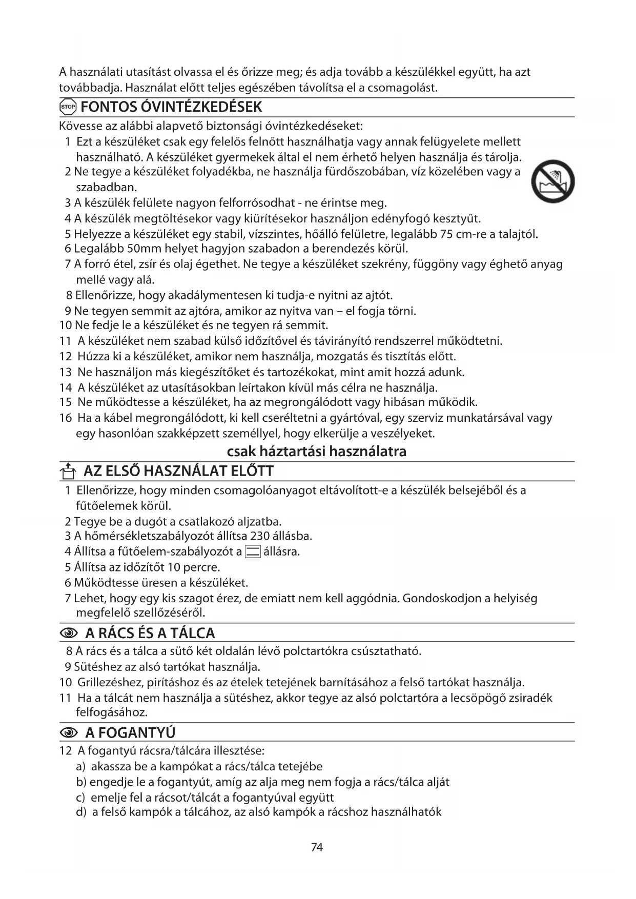 Kövesse az alábbi alapvető biztonsági óvintézkedéseket: 1 Ezt a készüléket csak egy felelős felnőtt használhatja vagy annak felügyelete mellett használható. A készüléket gyermekek által el nem érhető helyen használja és tárolja. 2 Ne tegye a készüléket folyadékba, ne használja fürdőszobában, víz közelében vagy a szabadban. 3 A készülék felülete nagyon felforrósodhat - ne érintse meg. 4 A készülék megtöltésekor vagy kiürítésekor használjon edényfogó kesztyűt. 5 Helyezze a készüléket egy stabil, vízszintes, hőálló felületre, legalább 75 cm-re a talajtól. 6 Legalább 50mm helyet hagyjon szabadon a berendezés körül. 7 A forró étel, zsír és olaj égethet. Ne tegye a készüléket szekrény, függöny vagy éghető anyag mellé vagy alá. 8 Ellenőrizze, hogy akadálymentesen ki tudja-e nyitni az ajtót. 9 Ne tegyen semmit az ajtóra, amikor az nyitva van – el fogja törni. 10 Ne fedje le a készüléket és ne tegyen rá semmit. 11 A készüléket nem szabad külső időzítővel és távirányító rendszerrel működtetni. 12 Húzza ki a készüléket, amikor nem használja, mozgatás és tisztítás előtt. 13 Ne használjon más kiegészítőket és tartozékokat, mint amit hozzá adunk. 14 A készüléket az utasításokban leírtakon kívül más célra ne használja. 15 Ne működtesse a készüléket, ha az megrongálódott vagy hibásan működik. 16 Ha a kábel megrongálódott, ki kell cseréltetni a gyártóval, egy szerviz munkatársával vagy egy hasonlóan szakképzett személlyel, hogy elkerülje a veszélyeket. csak háztartási használatra U AZ ELSŐ HASZNÁLAT ELŐTT 1 Ellenőrizze, hogy minden csomagolóanyagot eltávolított-e a készülék belsejéből és a fűtőelemek körül. 2 Tegye be a dugót a csatlakozó aljzatba. 3 A hőmérsékletszabályozót állítsa 230 állásba. 4 Állítsa a fűtőelem-szabályozót a H állásra. 5 Állítsa az időzítőt 10 percre. 6 Működtesse üresen a készüléket. 7 Lehet, hogy egy kis szagot érez, de emiatt nem kell aggódnia. Gondoskodjon a helyiség megfelelő szellőzéséről. C A RÁCS ÉS A TÁLCA 8 A rács és a tálca a sütő két oldalán lévő polctartókra csúsztatható. 9 Sütéshez az alsó tartókat használja. 10 Grillezéshez, pirításhoz és az ételek tetejének barnításához a felső tartókat használja. 11 Ha a tálcát nem használja a sütéshez, akkor tegye az alsó polctartóra a lecsöpögő zsiradék felfogásához.