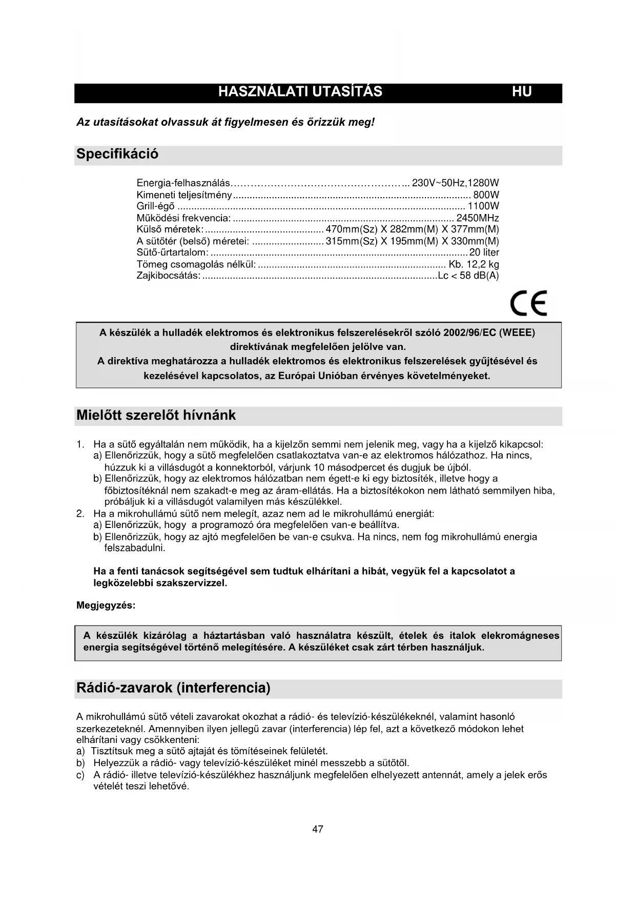 a) Ellenőrizzük, hogy a programozó óra megfelelően van-e beállìtva. b) Ellenőrizzük, hogy az ajtó megfelelően be van-e csukva. Ha nincs, nem fog mikrohullámú energia felszabadulni. Ha a fenti tanácsok segítségével sem tudtuk elhárítani a hibát, vegyük fel a kapcsolatot a legközelebbi szakszervizzel. Megjegyzés: Rádió-zavarok (interferencia) A mikrohullámú sütő vételi zavarokat okozhat a rádió- és televìzió-készülékeknél, valamint hasonló szerkezeteknél. Amennyiben ilyen jellegű zavar (interferencia) lép fel, azt a következő módokon lehet elhárìtani vagy csökkenteni: a) Tisztìtsuk meg a sütő ajtaját és tömìtéseinek felületét. b) Helyezzük a rádió- vagy televìzió-készüléket minél messzebb a sütőtől. c) A rádió- illetve televìzió-készülékhez használjunk megfelelően elhelyezett antennát, amely a jelek erős vételét teszi lehetővé. A készülék kizárólag a háztartásban való használatra készült, ételek és italok elekromágneses energia segítségével történň melegítésére. A készüléket csak zárt térben használjuk. A készülék a hulladék elektromos és elektronikus felszerelésekrňl szóló 2002/96/EC (WEEE) direktívának megfelelňen jelölve van. A direktíva meghatározza a hulladék elektromos és elektronikus felszerelések gyűjtésével és kezelésével kapcsolatos, az Európai Unióban érvényes követelményeket.48 Elhelyezés