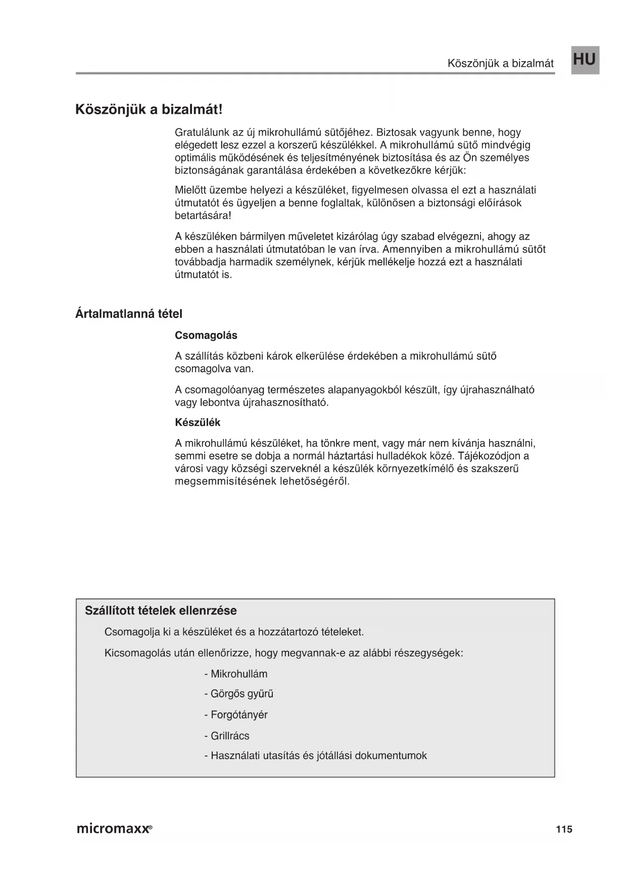 Ellenorizze, hogy valamennyi tartozekalkatrész meg van-e, mielott a csomagolast eldobja. - Mielott az uy grillfunkciós és forróvegős mikrohullámú készülékét elso alkalommal üzembe helyezi, elóször tisztítsa meg azt és a tartozékalkatrészeit a gyártás során esetleg rajtuk marad anyagoktól.