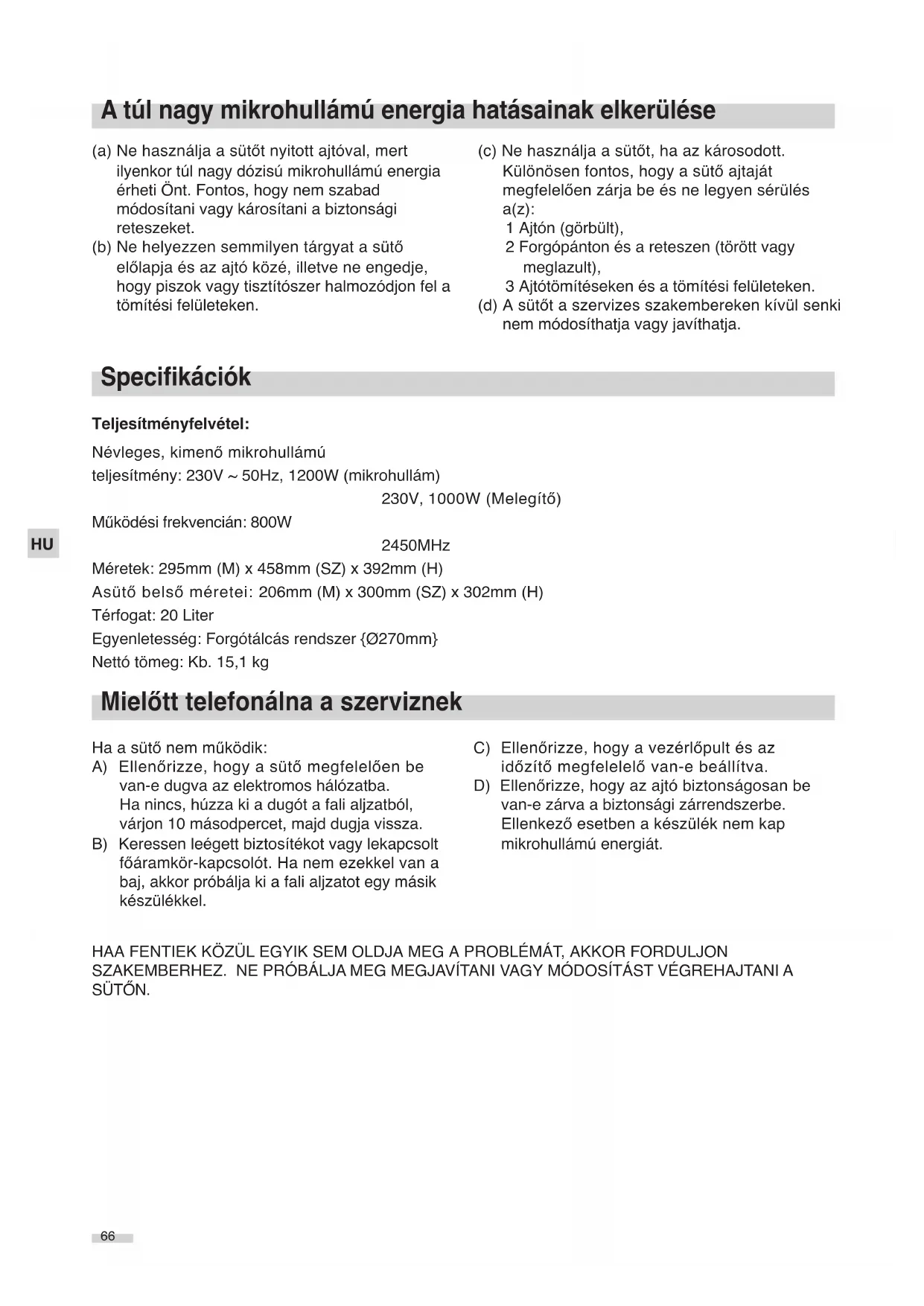 (a) Ne használja a sütőt nyitott ajtóval, mert ilyenkor túl nagy dózisú mikrohullámú energia érheti Önt. Fontos, hogy nem szabad módosítani vagy károsítani a biztonsági reteszeket. (b) Ne helyezzen semmilyen tárgyat a sütő előlapja és az ajtó közé, illetve ne engedje, hogy piszok vagy tisztítószer halmozódjon fel a tömítési felületeken. (c) Ne használja a sütőt, ha az károsodott. Különösen fontos, hogy a sütő ajtaját megfelelően zárja be és ne legyen sérülés a(z): 1 Ajtón (görbült), 2 Forgópánton és a reteszen (törött vagy meglazult), 3 Ajtótömítéseken és a tömítési felületeken. (d) A sütőt a szervizes szakembereken kívül senki nem módosíthatja vagy javíthatja. Teljesítményfelvétel: Névleges, kimenő mikrohullámú teljesítmény: 230V ~ 50Hz, 1200W (mikrohullám) 230V, 1000W (Melegítő) Működési frekvencián: 800W 2450MHz Méretek: 295mm (M) x 458mm (SZ) x 392mm (H) Asütő belső méretei: 206mm (M) x 300mm (SZ) x 302mm (H) Térfogat: 20 Liter Egyenletesség: Forgótálcás rendszer {Ø270mm} Nettó tömeg: Kb. 15,1 kg HAA FENTIEK KÖZÜL EGYIK SEM OLDJA MEG A PROBLÉMÁT, AKKOR FORDULJON SZAKEMBERHEZ. NE PRÓBÁLJA MEG MEGJAVÍTANI VAGY MÓDOSÍTÁST VÉGREHAJTANI A SÜTŐN.
