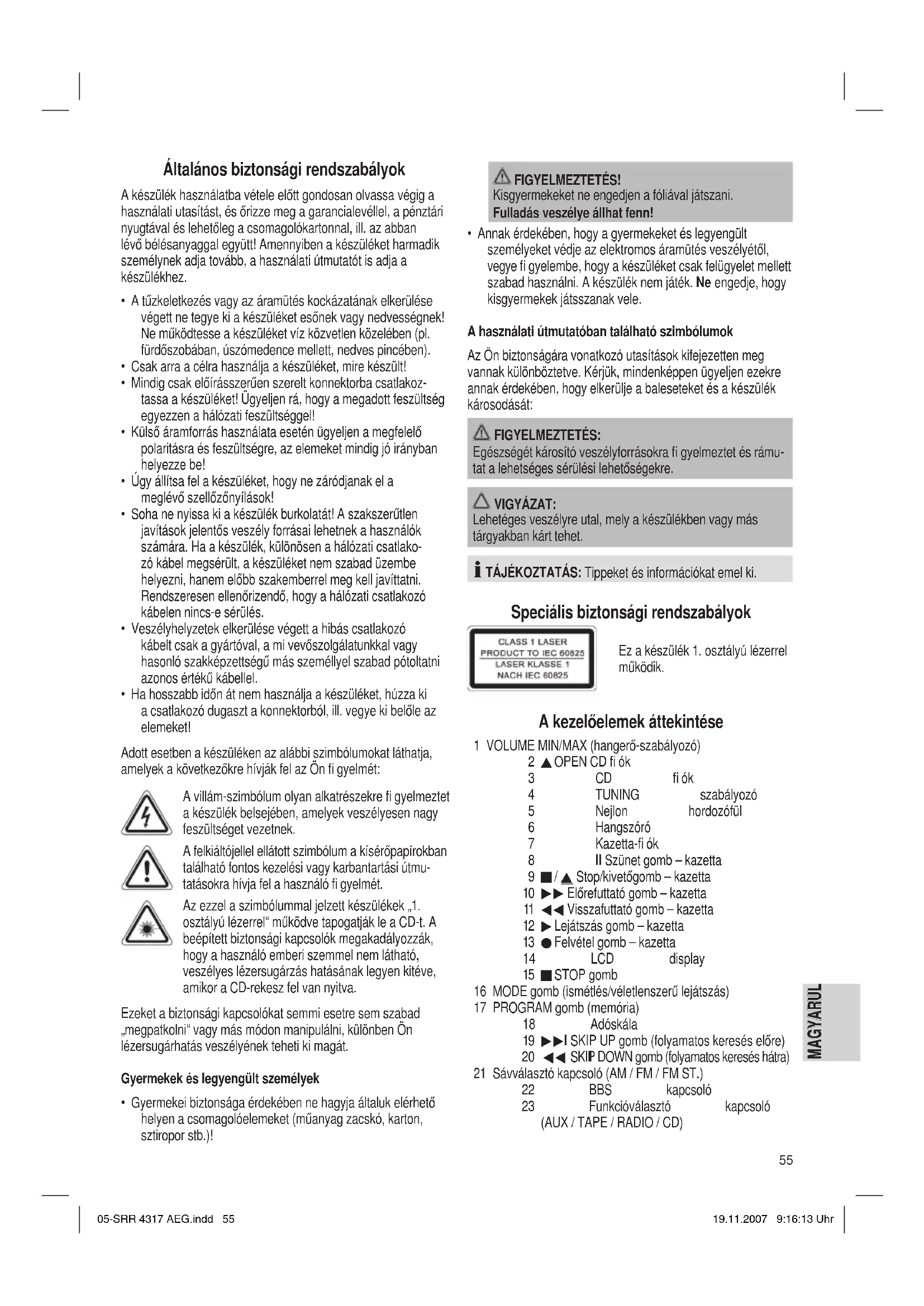 - A CD-re nem szabad a hagyományos hanglemezek- hez hasonló módon tisztítószert vagy elektrosztatikus feltöltődést gátló szert fújni. 05-SRR 4317 AEG.indd 5805-SRR 4317 AEG.indd 58 19.11.2007 9:16:14 Uhr19.11.2007 9:16:14 Uhr59 MAGYARUL MAGYARUL Zavarelhárítás Tünet Ok Megoldás A CD-t nem lehet lejátszani. Nincs betéve, vagy hibásan van betéve a CD. Győződjék meg róla, hogy a diszk úgy van-e behelyezve, hogy a rajta lévő felirat felfelé néz. Túl gyengék az elemek. Helyezzen be új elemeket vagy hálózati vezetékkel üzemeltesse a készüléket. A CD lejátszás közben ugrik. Ellenőrizze, hogy nincsenek-e a disz- ken ujjlenyomatok, szennyeződés vagy karcolás! Tisztítsa meg a dis- zket puha ruhával úgy, hogy a ruhát a diszk középétől a széle felé húzza. Műszaki adatok Modell: ........................................................ SRR 4317 CD/MP3 Feszültségellátás: .................................................. 230 V, 50 Hz Elemes üzemmód: ...........................10 x 1,5 V, UM1 / R20 típus Kimeneti teljesítmény: ...........................................400 W PMPO Védelmi osztály: ........................................................................ΙΙ Rádiórész: Frekvenciatartományok: .............URH / FM 88 ~ 108,0 MHz ............... MW / AM 540 ~ 1600 kHz Nettó súly: ..........................................................................7,2 kg Ezt a készüléket az Európa Tanács minden vonatkozó aktuális irányelve szerint (pl. elektromágnesesség-elviselő képesség vagy kisfeszültség-elviselő képesség) ellenőriztük, és a legújabb biztonságtechnikai előírások szerint készült. A műszaki változtatások jogát fenntartjuk. Garancia Garanciális igényeivel forduljon, kérem, a szerződéses kereskedőjéhez! A garancia igazolására a pénztári nyugta szolgál. E nélkül az igazolás nélkül sem díjmentes csere, sem díjtalan javítás nem végezhető. Garanciális esetben eredeti csomagolásában adja át az alap- készüléket a pénztári bizonylattal együtt annak a kereskedőnek, akitől a készüléket vásárolta! Sem az elhasználódó tartozékokban, ill. kopó alkatrészekben bekövetkező hibák, sem a tisztítás, karbantartás vagy a kopó alkatrészek cseréje nem esik a garancia hatálya alá, követke- zésképp térítésköteles. Illetéktelen beavatkozás a garancia megszűnését eredményezi. A garanciális idő után A garanciális idő eltelte után a megfelelő szakkereskedésben vagy javítószolgálatnál végeztethet térítésköteles javításokat. A „kuka“ piktogram jelentése Kímélje környezetünket, az elektromos készülékek nem a háztartási szemétbe valók! Használja az elektromos készülékek ártalmatlanítására kijelölt gyűjtőhelyeket, ott adja le azokat az elektromos készülékeit, amelyeket többé már nem kíván használni! Ezzel segítséget nyújt ahhoz, hogy elkerülhetők legyenek azok a hatások, amelyeket a helytelen „szemétre dobás“ gyakorolhat a környezetre és az emberi egészségre. Ezzel hozzájárul az újrahasznosításhoz, a recyclinghoz és a kiöregedett elektromos és elektronikus készülékek értékesítésé- nek egyéb formáihoz. Az önkormányzatoknál vagy a polgármesteri hivatalokban tájékoztatást kaphat arról, hogy hova viheti a kiselejtezett készülékeket. 05-SRR 4317 AEG.indd 5905-SRR 4317 AEG.indd 59 19.11.2007 9:16:15 Uhr19.11.2007 9:16:15 Uhr60