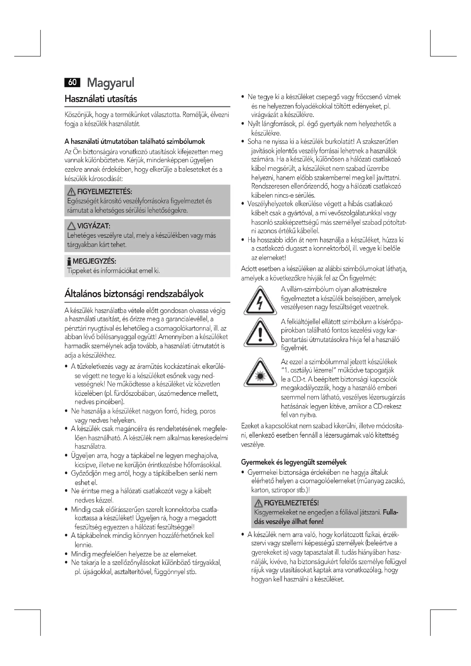 - Ha hosszabb időn át nem használja a készüléket, húzza ki a csatlakozó dugaszt a konnektorból, ill. vegye ki belőle az elemeket! Adott esetben a készüléken az alábbi szimbólumokat láthatja, amelyek a következőkre hívják fel az Ön figyelmét: A villám-szimbólum olyan alkatrészekre figyelmeztet a készülék belsejében, amelyek veszélyesen nagy feszültséget vezetnek. A felkiáltójellel ellátott szimbólum a kísérőpa- pírokban található fontos kezelési vagy kar- bantartási útmutatásokra hívja fel a használó figyelmét. Az ezzel a szimbólummal jelzett készülékek “1. osztályú lézerrel” működve tapogatják le a CD-t. A beépített biztonsági kapcsolók megakadályozzák, hogy a használó emberi szemmel nem látható, veszélyes lézersugárzás hatásának legyen kitéve, amikor a CD-rekesz fel van nyitva. Ezeket a kapcsolókat nem szabad kikerülni, illetve módosíta- ni, ellenkező esetben fennáll a lézersugárnak való kitettség veszélye. Gyermekek és legyengült személyek