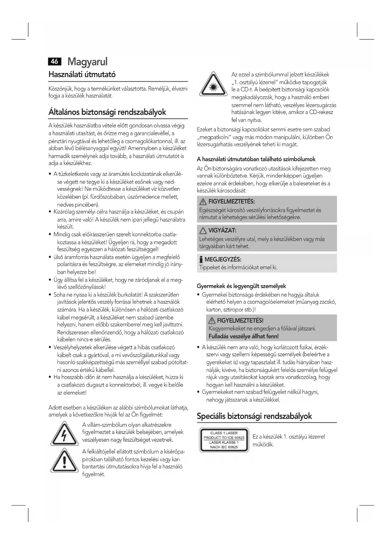 - Gyermekeket nem szabad felügyelet nélkül hagyni, nehogy játsszanak a készülékkel. Speciális biztonsági rendszabályok Ez a készülék 1. osztályú lézerrel működik.Magyarul