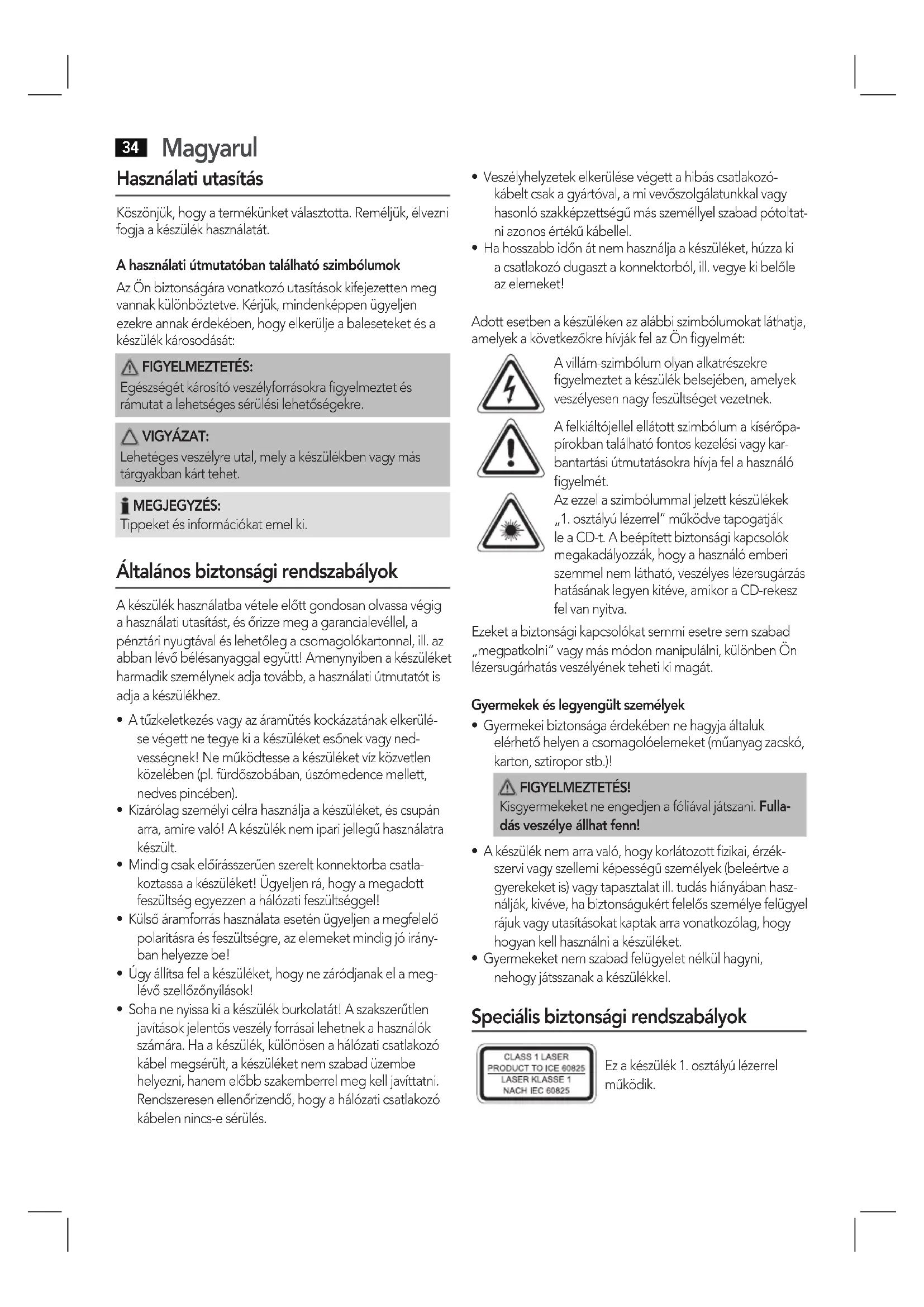 - Gyermekeket nem szabad felügyelet nélkül hagyni, nehogy játsszanak a készülékkel. Speciális biztonsági rendszabályok Ez a készülék 1. osztályú lézerrel működik.Magyarul