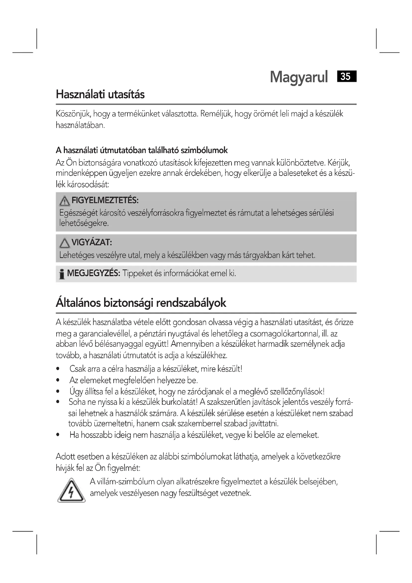 - Hahosszabbideignemhasználjaakészüléket,vegyekibelőleazelemeket. Adott esetben a készüléken az alábbi szimbólumokat láthatja, amelyek a következőkre hívják fel az Ön figyelmét: A villám-szimbólum olyan alkatrészekre figyelmeztet a készülék belsejében, amelyek veszélyesen nagy feszültséget vezetnek.Magyarul