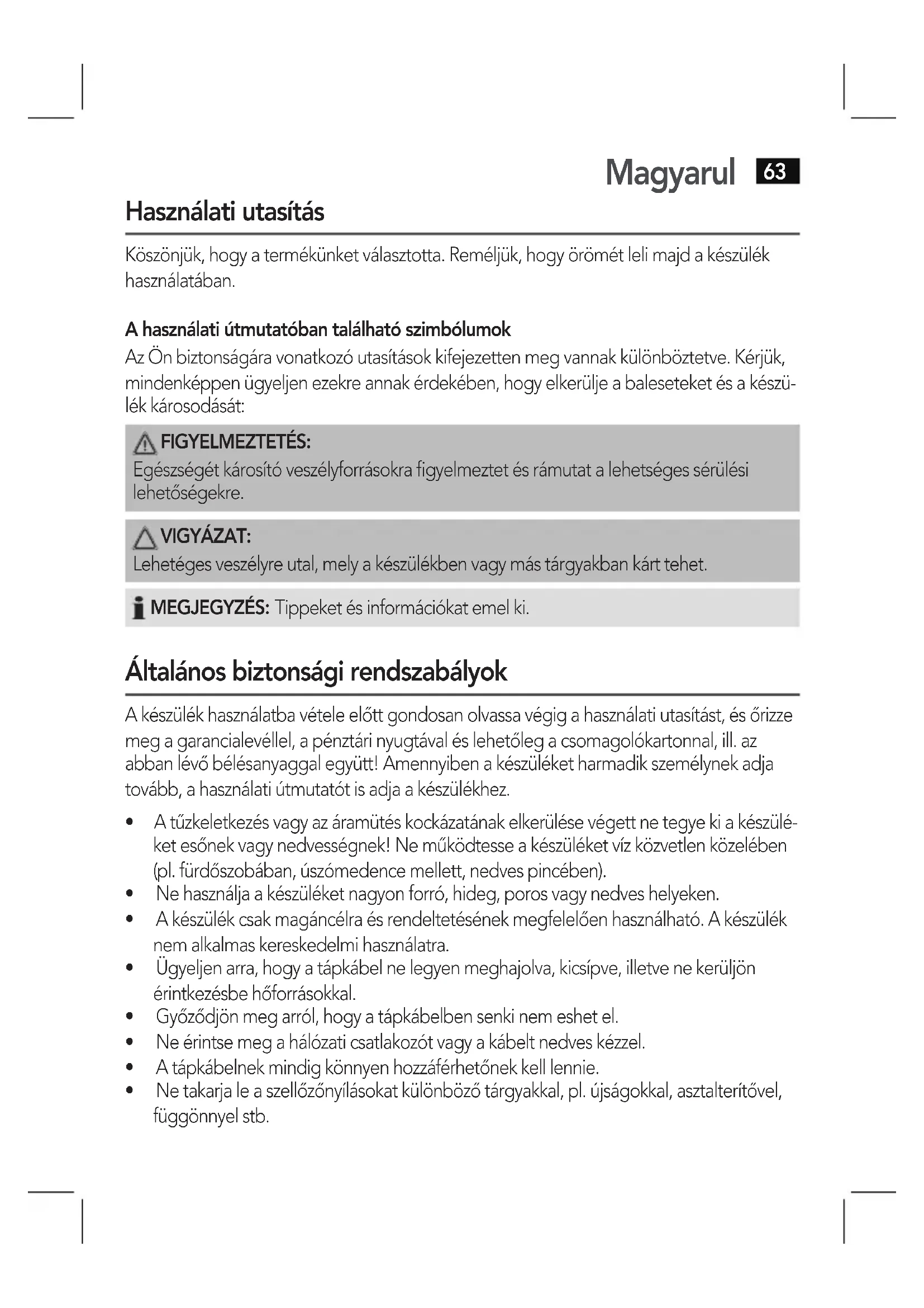 Használati utasítás Köszönjük, hogy a termékünket választotta. Reméljük, hogy örömét leli majd a készülék használatában. A használati útmutatóban található szimbólumok Az Ön biztonságára vonatkozó utasítások kifejezetten meg vannak különböztetve. Kérjük, mindenképpen ügyeljen ezekre annak érdekében, hogy elkerülje a baleseteket és a készü- lék károsodását: FIGYELMEZTETÉS: Egészségét károsító veszélyforrásokra figyelmeztet és rámutat a lehetséges sérülési lehetőségekre. VIGYÁZAT: Lehetéges veszélyre utal, mely a készülékben vagy más tárgyakban kárt tehet. MEGJEGYZÉS: Tippeket és információkat emel ki. Általános biztonsági rendszabályok A készülék használatba vétele előtt gondosan olvassa végig a használati utasítást, és őrizze meg a garancialevéllel, a pénztári nyugtával és lehetőleg a csomagolókartonnal, ill. az abbanlévőbélésanyaggalegyütt!Amennyibenakészüléketharmadikszemélynekadja tovább, a használati útmutatót is adja a készülékhez.