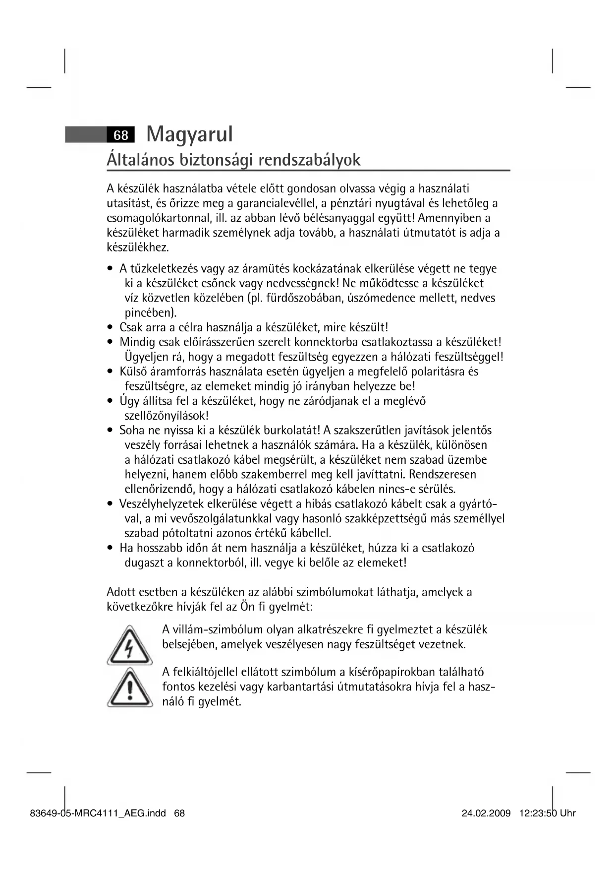 - Ha hosszabb időn át nem használja a készüléket, húzza ki a csatlakozó dugaszt a konnektorból, ill. vegye ki belőle az elemeket! Adott esetben a készüléken az alábbi szimbólumokat láthatja, amelyek a következőkre hívják fel az Ön gyelmét: A villám-szimbólum olyan alkatrészekre gyelmeztet a készülék belsejében, amelyek veszélyesen nagy feszültséget vezetnek. A felkiáltójellel ellátott szimbólum a kísérőpapírokban található fontos kezelési vagy karbantartási útmutatásokra hívja fel a hasz- náló gyelmét. 83649-05-MRC4111_AEG.indd 6883649-05-MRC4111_AEG.indd 68 24.02.2009 12:23:50 Uhr24.02.2009 12:23:50 UhrMagyarul
