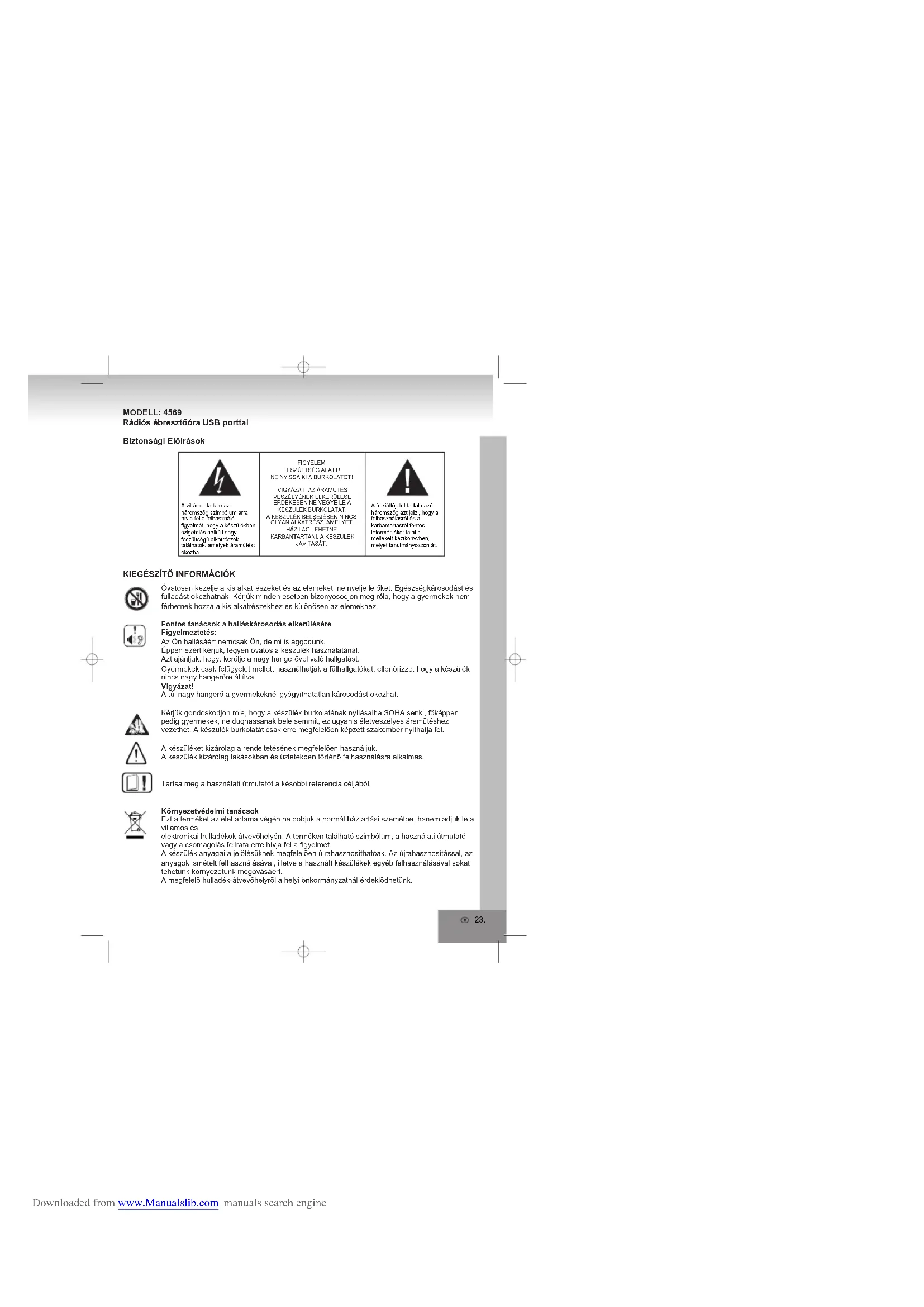 FIGYELEMFESZÜLTSÉG ALATT!NE NYISSA KI A BURKOLATOT!VIGYÁZAT: AZ ÁRAMÜTÉS VESZÉLYÉNEK ELKERÜLÉSE ÉRDEKÉBEN NE VEGYE LE A KÉSZÜLÉK BURKOLATÁT. A KÉSZÜLÉK BELSEJÉBEN NINCS OLYAN ALKATRÉSZ, AMELYET HÁZILAG LEHETNE KARBANTARTANI. A KÉSZÜLÉK JAVÍTÁSÁT. Downloaded from www.Manualslib.com manuals search engineNe akadályozza a készülék szellőzését, például függönnyel, újsággal, takaróval vagy bútorral. Aszellőzőnyílásoknak mindig szabadon kell maradnia. A túlmelegedés kárt tehet a készülékben, és emiatt annak élettartama lerövidülhet.Meleg és forróságNe tegyük ki a készüléket a közvetlen napsütés hatásának. Ügyeljünk arra, hogy a készülék ne legyen fűtőberendezés, nyílt láng vagy egyéb hőforrás közelében. A készülék szellőzőnyílásait mindig hagyjuk szabadon.Nedvesség és tisztításA készülék nem vízálló! Soha se merítse vízbe. Gondoskodjon arról, hogy a készülék ne érintkez zen vízzel. A készülékbe kerülő víz súlyosan megrongálhatják a készüléket. Ne használjon alkoholos, ammóniás, benzolos vagy súrolószeres tisztítószereket, mivel ezek kárt okozhatnak a készülékben. A tisztításhoz használjon nedves, puha anyagot.Előírásos hulladék-elhelyezésAz elemek és a csomagolóanyagok nem a háztartási szemétbe valók. Az elemeket a használt elemek számára kijelölt gyűjtőhelyre vigyük. A csomagolóanyagok szelektív elhelyezése szintén védi környezetünket.