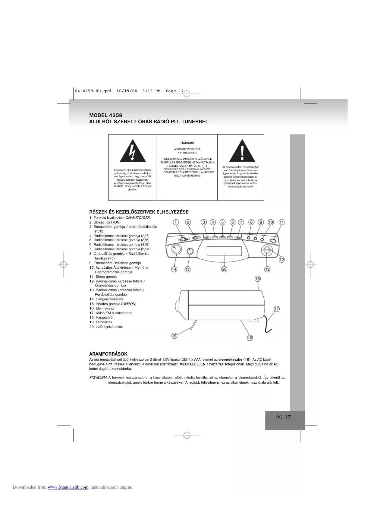 03-4259-FR.qxd 10/19/06 3:11 PM Page 16 Downloaded from www.Manualslib.com manuals search engineRÉSZEK ÉS KEZELŐSZERVEK ELHELYEZÉSE 1. Funkció kiválasztás (ON/AUTO/OFF):2. Blokád (OFF/ON)3. Ébresztőóra gombja / tárolt rádióállomás(1/6)4. Rádióállomás tárolása gombja (2/7)5. Rádióállomás tárolása gombja (3/8)6. Rádióállomás tárolása gombja (4/9)7. Rádióállomás tárolása gombja (5/10)8. Órabeállítás gombja / Rádióállomástárolása (+5)9. Ébresztőóra Beállítása gombja10. Az Időzítés Áttekintése / MemóriaBeprogramozás gombja11. Sleep gombja12. Rádióállomás keresése felfelé /Órabeállítás gombja13. Rádióállomás keresése lefelé /Percbeálltás gombja14. Hangerő vezerlés15. Időzítés gombja (OFF/ON)16. Elemrekesz17. Külső FM huzalantenna18. Hangszóró19. Támaszték20. LCD-kijelző ablak ÁRAMFORRÁSOK Az óra fenntartási céljából helyezze be 2 db-ot 1,5V típusú (UM-4 x AAA) elemet az elemrekeszbe (16). Az AC-kábel bedugása előtt, tessék ellenőrizni a készülék adattábláját. MEGFELELJEN a háztartási főtáplálónak. Majd dugja be az AC kábel dugót a konnektorba. FFIIGGYYEELLEEMM : A tervezet hosszú szünet a használatban előtt, mindig távolítsa el az elemeket a elemrekeszból. Így elkerül az elemszivárgást, amely tönkre tenné a készüléket. A legjobb teljesítményhez az alkali elmek használata ajánlott. H 17. MODEL 4259 ALULRÓL SZERELT ÓRÁS RÁDIÓ PLL TUNERREL Az egyenlő oldalú háromszögbennyílban végződő villám szimbólumarra figyelmeztet, hogy a készülékbelsejében nem leszigetelt,veszélyes magasfeszültségű áramtalálható, amely komoly áramütéstokozhat! FFIIGGYYEELLEEMM!! ÁRAMÜTÉS VESZÉLYENE NYISSA FEL!FIGYELEM: AZ ÁRAMÜTÉS VESZÉLYÉNEKELKERÜLÉS ÉRDEKÉBEN NE TÁVOLÍTSA EL AFEDELET (VAGY A HÁTLAPOT)! ITTNINCSENEK A FELHASZNÁLÓ SZÁMÁRAHOZZÁFÉRHETŐ ALKATRÉSZEK. A JAVÍTÁSTBÍZZA SZAKEMBERREAz egyenlő oldalú háromszögbenlévő felkiáltójel szimbólum arrafigyelmeztet, hogy a készülékkelszállított dokumentumokban ahasználattal és karbantartással(javítással) kapcsolatos fontosútmutatások találhatók. 04-4259-HU.qxd 10/19/06 3:12 PM Page 17 Downloaded from www.Manualslib.com manuals search engineFONTOS Ez a készülék technikailag magas színvonalú. Bármely hiba keletkezés esetében távolítson el az AC-kábelt és elemeket párpercre, hogy a készüléket teljesen bezárja a villánytól. Majd újra helyezze a készüléket az áram alá. Ez a készülék különösen tervezet a konyhaszekrény alatti hozzáerősítéshez (tessék használni a csatolt csavarokat). Ezen kívül asztalra is elhelyezhető a tamaszték használatával.
