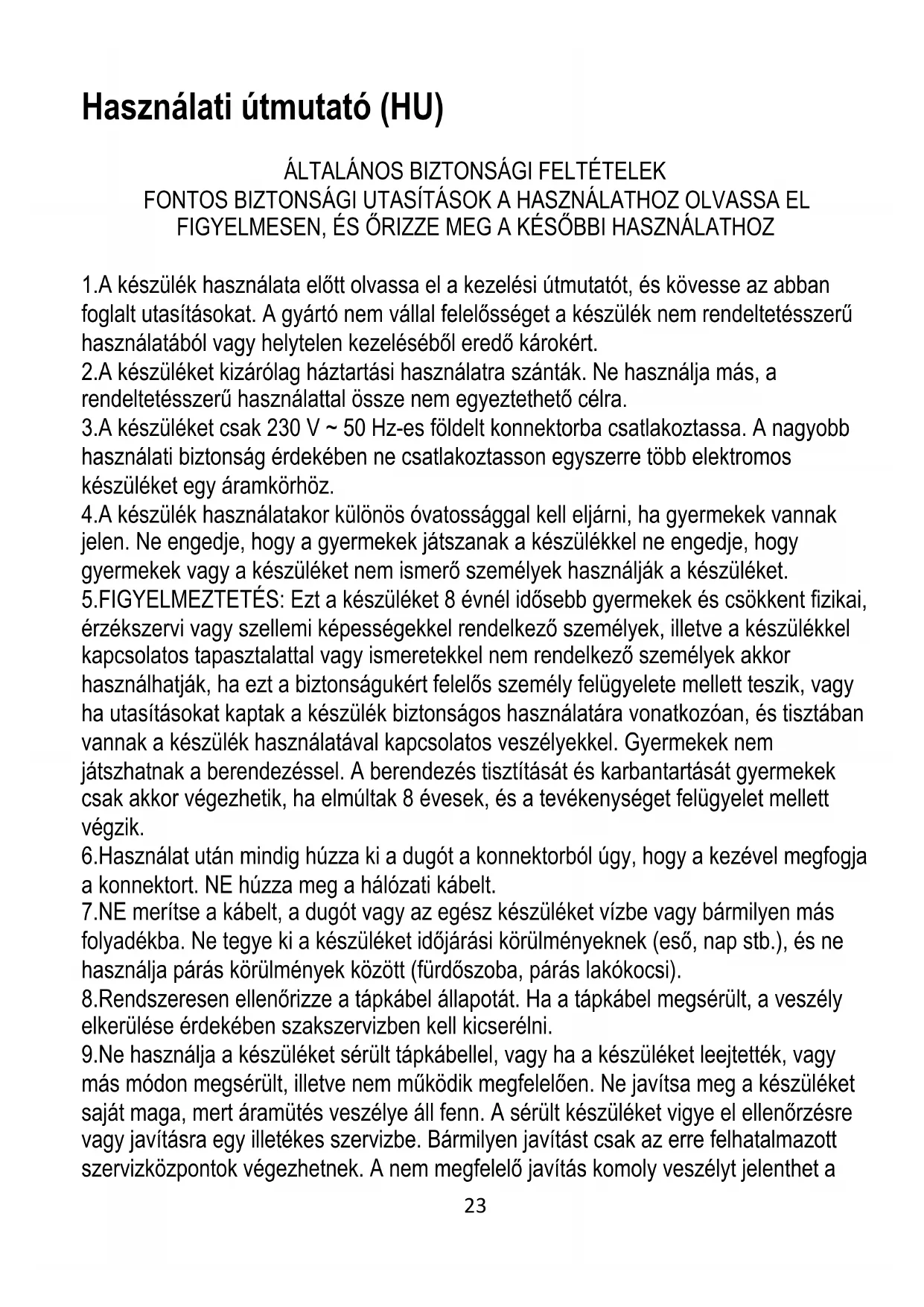 FONTOS BIZTONSÁGI UTASÍTÁSOK A HASZNÁLATHOZ OLVASSA EL FIGYELMESEN, ÉS ŐRIZZE MEG A KÉSŐBBI HASZNÁLATHOZ 1.A készülék használata előtt olvassa el a kezelési útmutatót, és kövesse az abban foglalt utasításokat. A gyártó nem vállal felelősséget a készülék nem rendeltetésszerű használatából vagy helytelen kezeléséből eredő károkért. 2.A készüléket kizárólag háztartási használatra szánták. Ne használja más, a rendeltetésszerű használattal össze nem egyeztethető célra. 3.A készüléket csak 230 V ~ 50 Hz-es földelt konnektorba csatlakoztassa. A nagyobb használati biztonság érdekében ne csatlakoztasson egyszerre több elektromos készüléket egy áramkörhöz. 4.A készülék használatakor különös óvatossággal kell eljárni, ha gyermekek vannak jelen. Ne engedje, hogy a gyermekek játszanak a készülékkel ne engedje, hogy gyermekek vagy a készüléket nem ismerő személyek használják a készüléket. 5.FIGYELMEZTETÉS: Ezt a készüléket 8 évnél idősebb gyermekek és csökkent fizikai, érzékszervi vagy szellemi képességekkel rendelkező személyek, illetve a készülékkel kapcsolatos tapasztalattal vagy ismeretekkel nem rendelkező személyek akkor használhatják, ha ezt a biztonságukért felelős személy felügyelete mellett teszik, vagy ha utasításokat kaptak a készülék biztonságos használatára vonatkozóan, és tisztában vannak a készülék használatával kapcsolatos veszélyekkel. Gyermekek nem játszhatnak a berendezéssel. A berendezés tisztítását és karbantartását gyermekek csak akkor végezhetik, ha elmúltak 8 évesek, és a tevékenységet felügyelet mellett végzik. 6.Használat után mindig húzza ki a dugót a konnektorból úgy, hogy a kezével megfogja a konnektort. NE húzza meg a hálózati kábelt. 7.NE merítse a kábelt, a dugót vagy az egész készüléket vízbe vagy bármilyen más folyadékba. Ne tegye ki a készüléket időjárási körülményeknek (eső, nap stb.), és ne használja párás körülmények között (fürdőszoba, párás lakókocsi). 8.Rendszeresen ellenőrizze a tápkábel állapotát. Ha a tápkábel megsérült, a veszély elkerülése érdekében szakszervizben kell kicserélni. 9.Ne használja a készüléket sérült tápkábellel, vagy ha a készüléket leejtették, vagy más módon megsérült, illetve nem működik megfelelően. Ne javítsa meg a készüléket saját maga, mert áramütés veszélye áll fenn. A sérült készüléket vigye el ellenőrzésre vagy javításra egy illetékes szervizbe. Bármilyen javítást csak az erre felhatalmazott szervizközpontok végezhetnek. A nem megfelelő javítás komoly veszélyt jelenthet a24 felhasználóra nézve. 10.A készüléket hideg, stabil, vízszintes felületre kell helyezni, távol a forró főzőberendezésektől, például elektromos tűzhelytől, gázégőtől stb. 11.Ne használja a készüléket gyúlékony anyagok közelében. 12.A tápkábel nem lóghat az asztal széle fölé, és nem érintkezhet forró felületekkel. 13.Ne hagyja a készüléket vagy a konnektorba dugott tápegységet felügyelet nélkül. 14.A további védelem érdekében ajánlatos az elektromos áramkörbe egy olyan hibásáramú készüléket (RCD) beszerelni, amelynek névleges hibaáramú értéke nem haladja meg a 30 mA-t. Ezzel kapcsolatban villanyszerelő szakemberrel kell konzultálni.