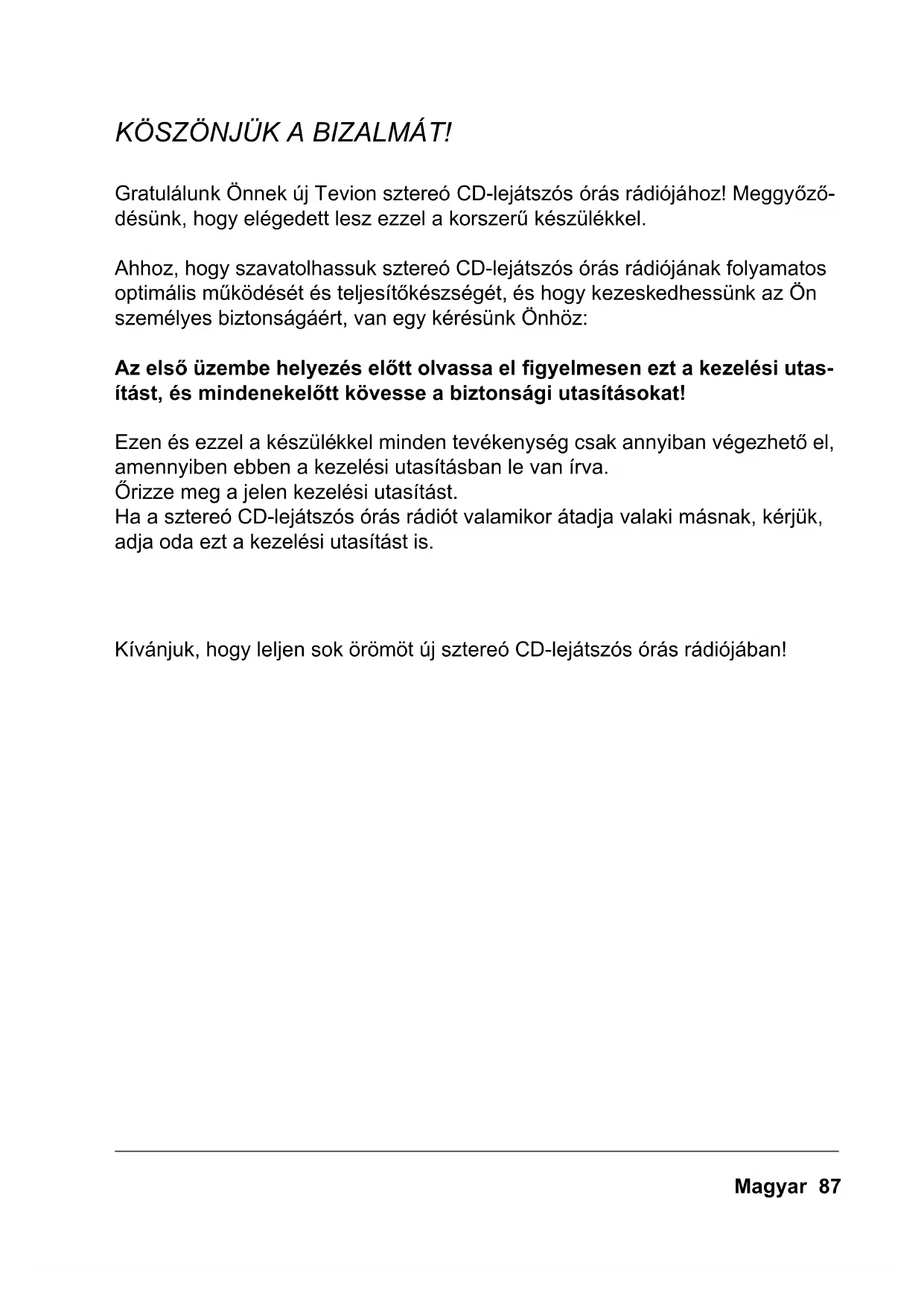 CDR 2009.book Seite 86 Donnerstag, 25. September 2008 3:46 15Magyar 87 KÖSZÖNJÜK A BIZALMÁT! Gratulálunk Önnek új Tevion sztereó CD-lejátszós órás rádiójához! Meggyőző- désünk, hogy elégedett lesz ezzel a korszerű készülékkel. Ahhoz, hogy szavatolhassuk sztereó CD-lejátszós órás rádiójának folyamatos optimális működését és teljesítőkészségét, és hogy kezeskedhessünk az Ön személyes biztonságáért, van egy kérésünk Önhöz: Az első üzembe helyezés előtt olvassa el figyelmesen ezt a kezelési utas- ítást, és mindenekelőtt kövesse a biztonsági utasításokat! Ezen és ezzel a készülékkel minden tevékenység csak annyiban végezhető el, amennyiben ebben a kezelési utasításban le van írva. Őrizze meg a jelen kezelési utasítást. Ha a sztereó CD-lejátszós órás rádiót valamikor átadja valaki másnak, kérjük, adja oda ezt a kezelési utasítást is. Kívánjuk, hogy leljen sok örömöt új sztereó CD-lejátszós órás rádiójában! CDR 2009.book Seite 87 Donnerstag, 25. September 2008 3:46 1588 Magyar
