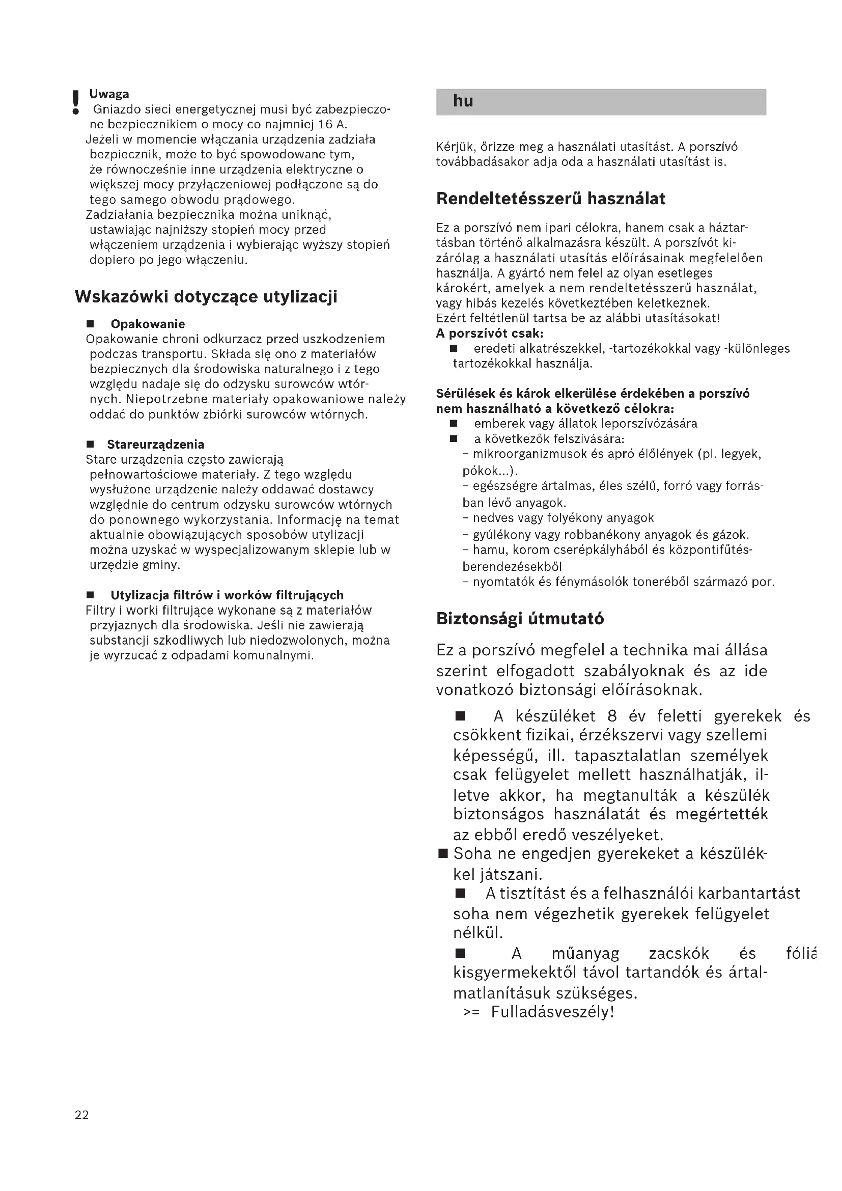 Uwaga Gniazdo sieci energetycznej musi być zabezpieczo- ne bezpiecznikiem o mocy co najmniej 16 A. Jeżeli w momencie włączania urządzenia zadziała bezpiecznik, może to być spowodowane tym, że równocześnie inne urządzenia elektryczne o większej mocy przyłączeniowej podłączone są do tego samego obwodu prądowego. Zadziałania bezpiecznika można uniknąć, ustawiając najniższy stopień mocy przed włączeniem urządzenia i wybierając wyższy stopień dopiero po jego włączeniu. Wskazówki dotyczące utylizacji Opakowanie Opakowanie chroni odkurzacz przed uszkodzeniem podczas transportu. Składa się ono z materiałów bezpiecznych dla środowiska naturalnego i z tego względu nadaje się do odzysku surowców wtór- nych. Niepotrzebne materiały opakowaniowe należy oddać do punktów zbiórki surowców wtórnych. Stare urządzenia Stare urządzenia często zawierają pełnowartościowe materiały. Z tego względu wysłużone urządzenie należy oddawać dostawcy względnie do centrum odzysku surowców wtórnych do ponownego wykorzystania. Informację na temat aktualnie obowiązujących sposobów utylizacji można uzyskać w wyspecjalizowanym sklepie lub w urzędzie gminy. Utylizacja filtrów i worków filtrujących Filtry i worki filtrujące wykonane są z materiałów przyjaznych dla środowiska. Jeśli nie zawierają substancji szkodliwych lub niedozwolonych, można je wyrzucać z odpadami komunalnymi. Kérjük, őrizze meg a használati utasítást. A porszívó továbbadásakor adja oda a használati utasítást is. Rendeltetésszerű használat Ez a porszívó nem ipari célokra, hanem csak a háztar- tásban történő alkalmazásra készült. A porszívót ki- zárólag a használati utasítás előírásainak megfelelően használja. A gyártó nem felel az olyan esetleges károkért, amelyek a nem rendeltetésszerű használat, vagy hibás kezelés következtében keletkeznek. Ezért feltétlenül tartsa be az alábbi utasításokat! A porszívót csak: eredeti alkatrészekkel, -tartozékokkal vagy -különleges tartozékokkal használja. Sérülések és károk elkerülése érdekében a porszívó nem használható a következő célokra: emberek vagy állatok leporszívózására a következők felszívására: − mikroorganizmusok és apró élőlények (pl. legyek, pókok...). − egészségre ártalmas, éles szélű, forró vagy forrás- ban lévő anyagok. − nedves vagy folyékony anyagok − gyúlékony vagy robbanékony anyagok és gázok. − hamu, korom cserépkályhából és központifűtés- berendezésekből − nyomtatók és fénymásolók toneréből származó por. Biztonsági útmutató Ez a porszívó megfelel a technika mai állása szerint elfogadott szabályoknak és az ide vonatkozó biztonsági előírásoknak. A készüléket 8 év feletti gyerekek és csökkent fizikai, érzékszervi vagy szellemi képességű, ill. tapasztalatlan személyek csak felügyelet mellett használhatják, il- letve akkor, ha megtanulták a készülék biztonságos használatát és megértették az ebből eredő veszélyeket. Soha ne engedjen gyerekeket a készülék- kel játszani. A tisztítást és a felhasználói karbantartást soha nem végezhetik gyerekek felügyelet nélkül. A műanyag zacskók és fóliák kisgyermekektől távol tartandók és ártal- matlanításuk szükséges. >= Fulladásveszély! hu23 Megfelelő használat A porszívót csakis a típustábla szerint csatlakoztassa és helyezze üzembe. Soha ne használja porzsák, ill. portartály, motorvédő szűrő és kifúvószűrő nélkül. >= A készülék károsodhat! Kerülje a csővel és a szívófejjel történő szívást fej köze- lében. >= Sérülésveszély! Lépcső porszívózásánál a készüléket a lépcsőn a munkát végző személyhez képest lejjebb kell elhelyez- ni. Ne húzza / szállítsa a porszívót a hálózati csatlako- zókábelnél és a tömlőnél fogva. Ha a készülék hálózati csatlakozóvezetéke megsérül, a veszélyek elkerülése érdekében csak a gyártó, a vevőszolgálat vagy egy hasonlóan képzett személy cserélheti ki. Több óráig tartó, folyamatos üzemeltetést követően teljesen húzza ki a hálózati csatlakozókábelt. Ne a csatlakozókábelnél, hanem a csatlakozó dugónál fogva húzza ki a készüléket a hálózatból. A hálózati csatlakozókábelt ne húzza át éles pereme- ken és ne törje meg. Mielőtt bármilyen munkát elvégezne a porszívón, húz- za ki a hálózati csatlakozódugót. Sérült porszívót ne helyezzen üzembe. Zavar esetén húzza ki a hálózati csatlakozódugót. A veszélyek elkerülése érdekében a porszívón csak erre felhatalmazott vevőszolgálat végezhet javításokat és alkatrészcserét. Óvja a porszívót az időjárás hatásaitól, nedvességtől és hőforrásoktól. Ne tegyen éghető vagy alkoholtartalmú anyagokat a szűrőre (porzsák, motorvédőszűrő, kifúvószűrő stb.). A porszívó nem alkalmas építkezéseken való alkalma- zásra. >= Az építési törmelék felszívása a készülék sérülésé- hez vezethet. Ha nem porszívózik, kapcsolja ki a készüléket. A kiselejtezett készüléket azonnal tegye használhatatl- anná, ezután végezze el szakszerű ártalmatlanítását.