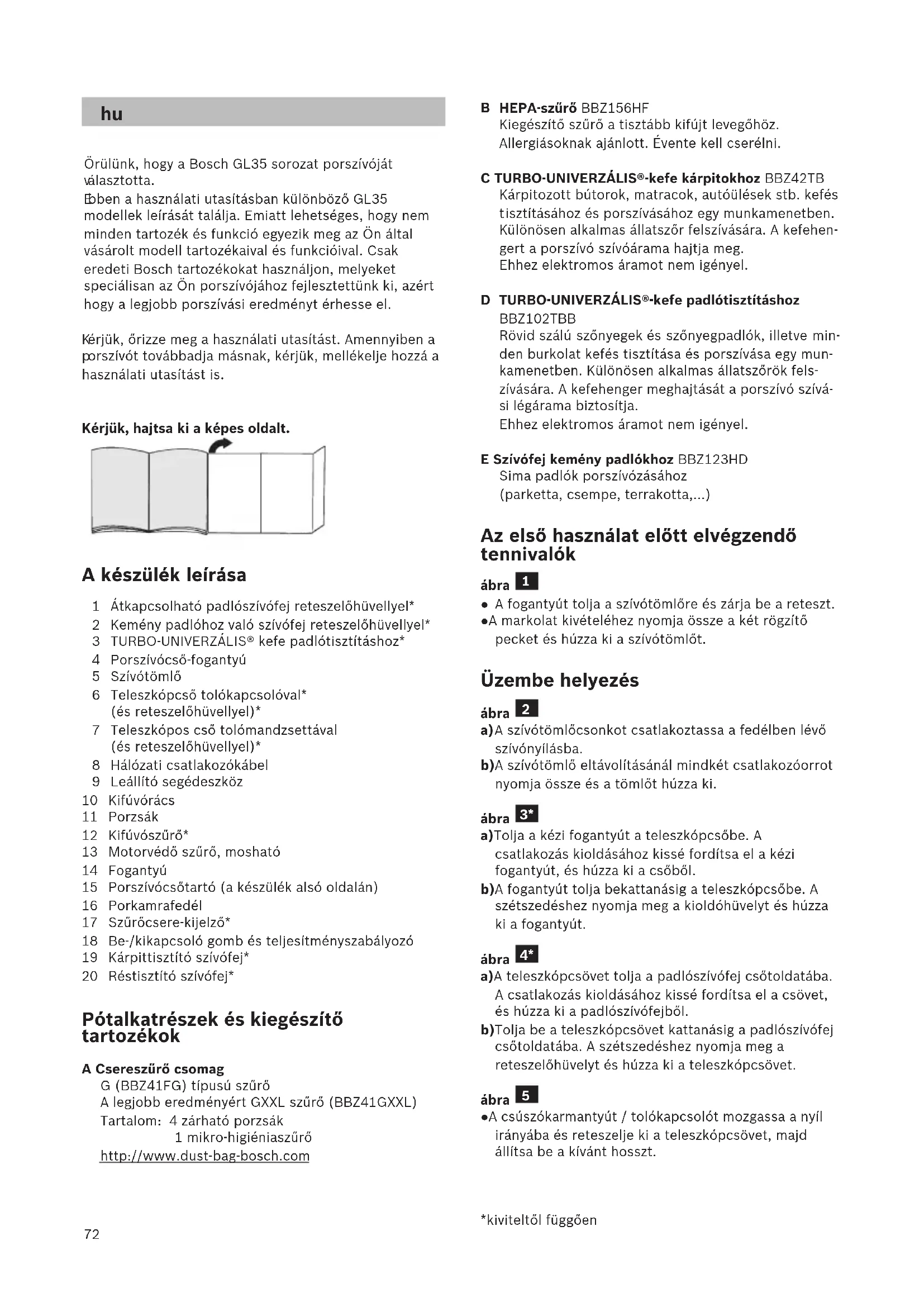 orszívót továbbadja másnak, kérjük, mellékelje hozzá a használati utasítást is. Kérjük, hajtsa ki a képes oldalt. A készülék leírása 1 Átkapcsolható padlószívófej reteszelőhüvellyel* 2 Kemény padlóhoz való szívófej reteszelőhüvellyel* 3 TURBO-UNIVERZÁLIS® kefe padlótisztításhoz* 4 Porszívócső-fogantyú 5 Szívótömlő 6 Teleszkópcső tolókapcsolóval* (és reteszelőhüvellyel)* 7 Teleszkópos cső tolómandzsettával (és reteszelőhüvellyel)* 8 Hálózati csatlakozókábel 9 Leállító segédeszköz 10 Kifúvórács 11 Porzsák 12 Kifúvószűrő* 13 Motorvédő szűrő, mosható 14 Fogantyú 15 Porszívócsőtartó (a készülék alsó oldalán) 16 Porkamrafedél 17 Szűrőcsere-kijelző* 18 Be-/kikapcsoló gomb és teljesítményszabályozó 19 Kárpittisztító szívófej* 20 Réstisztító szívófej* Pótalkatrészek és kiegészítő tartozékok A Csereszűrő csomag G (BBZ41FG) típusú szűrő A legjobb eredményért GXXL szűrő (BBZ41GXXL) Tartalom: 4 zárható porzsák 1 mikro-higiéniaszűrő http://www.dust-bag-bosch.com