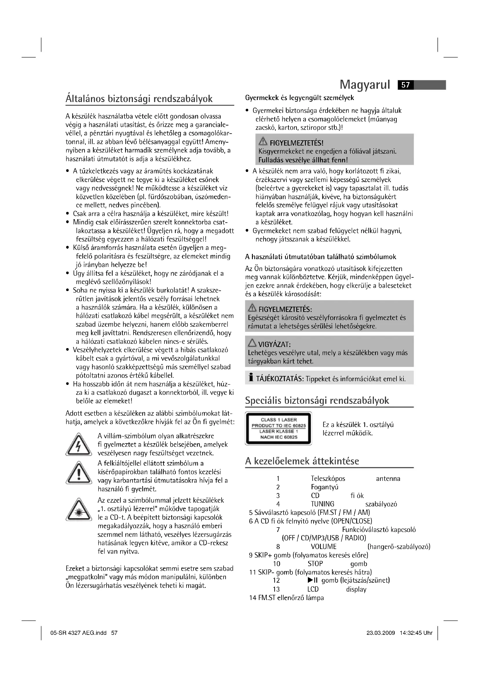 Az ezzel a szimbolummal jelzett keszülékek.1-osztalyu lezerrel" muködve tapogatjak le a CD-t. A beepitettBiztonsagi kapcsolok megakadalyozzák, hogy a hasznaló embarisi zemmel nem lathato, veszelyes lezersugárzs hatasanak legyen kitéve, amikor a CD-rekesz fel van nyitva.