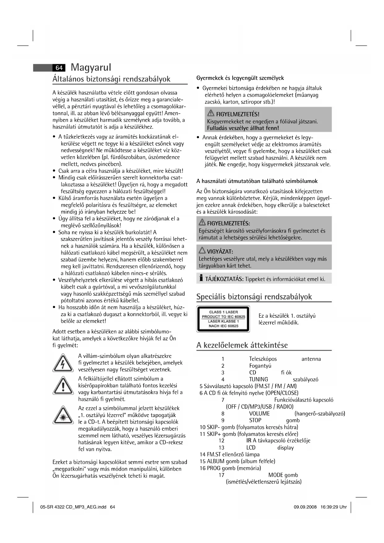 - Annak érdekében, hogy a gyermekeket és legy- engült személyeket védje az elektromos áramütés veszélyétől, vegye gyelembe, hogy a készüléket csak felügyelet mellett szabad használni. A készülék nem játék. Ne engedje, hogy kisgyermekek játsszanak vele. A használati útmutatóban található szimbólumok Az Ön biztonságára vonatkozó utasítások kifejezetten meg vannak különböztetve. Kérjük, mindenképpen ügyel- jen ezekre annak érdekében, hogy elkerülje a baleseteket és a készülék károsodását: FIGYELMEZTETÉS: Egészségét károsító veszélyforrásokra gyelmeztet és rámutat a lehetséges sérülési lehetőségekre. VIGYÁZAT: Lehetéges veszélyre utal, mely a készülékben vagy más tárgyakban kárt tehet. TÁJÉKOZTATÁS: Tippeket és információkat emel ki. Speciális biztonsági rendszabályok Ez a készülék 1. osztályú lézerrel működik. A kezelőelemek áttekintése 1 Teleszkópos antenna 2 Fogantyú 3 CD ók 4 TUNING szabályozó 5 Sávválasztó kapcsoló (FM.ST / FM / AM) 6 A CD ók felnyitó nyelve (OPEN/CLOSE) 7 Funkcióválasztó kapcsoló (OFF / CD/MP3/USB / RADIO) 8 VOLUME (hangerő-szabályozó) 9 STOP gomb 10 SKIP- gomb (folyamatos keresés hátra) 11 SKIP+ gomb (folyamatos keresés előre) 12 IR A távkapcsoló érzékelője 13 LCD display 14 FM.ST ellenőrző lámpa 15 ALBUM gomb (album felfele) 16 PROG gomb (memória) 17 MODE gomb (ismétlés/véletlenszerű lejátszás) 05-SR 4322 CD_MP3_AEG.indd 6405-SR 4322 CD_MP3_AEG.indd 64 09.09.2008 16:39:29 Uhr09.09.2008 16:39:29 UhrMagyarul