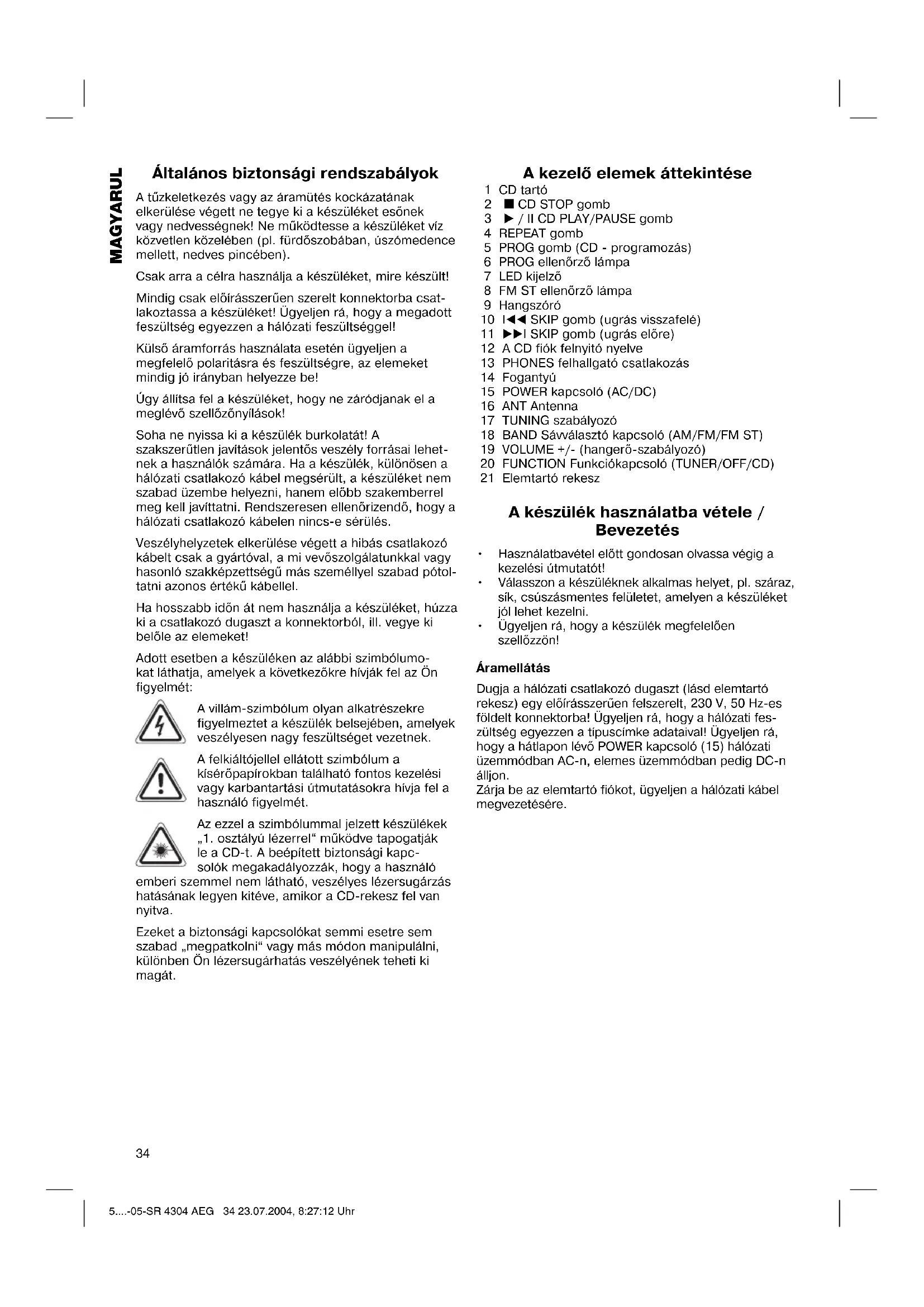 PROG. a poté tlačítko STOP (2). Kontrolní svítilna PROG (6) zhasne. Přístroj se automaticky zastaví poté, co byla uskutečněna reprodukce všech titulů. Naprogramova- né pořadí skladeb zůstane uchováno v paměti až do doby, než zvolíte jiný režim nebo než kompaktní disk vyjmete z mechaniky, resp. než přístroj vypnete. Můžete samozřejmě kombinovat reprodukci v napro- gramovaném pořadí s funkcí opakování. Po napro- gramování pořadí a spuštění přístroje stiskněte tlačítko REPEAT (4) až 3x a funkce mohou být použity tak, jak je popsáno v oddíle „REPEAT“. Tento přístroj byl testován podle všech příslušných, v současné době platných směrnic CE, jako je např. elektromagnetická kompatibilita a direktiva o nízkonapěťové bezpečnosti, a byl zkonstruován podle nejnovějších bezpečnostně-technických předpisů. Vyhrazujeme si technické změny! Záruka Na námi prodaný přístroj poskytujeme záruku v trvání 24 měsíců od data prodeje (pokladní doklad). Během záruční lhůty odstraníme bezplatně všechny vady přístroje nebo příslušenství*), které vzniknou v důsledku vad materiálu nebo výrobních vad, a to opravou nebo, podle našeho uvážení, formou výměny. Záruční plnění nemají za následek ani prodloužení záruční doby ani tím nevzniká nárok na novou záruku! Jako záruční doklad slouží doklad o koupi. Bez tohoto dokladu nelze uskutečnit bezplatnou výměnu nebo bezplatnou opravu. V záručním případě předejte kompletní přístroj včetně originálního obalu a spolu s pokladním dokladem Vašemu prodejci. *) Poškození příslušenství není automaticky důvodem pro bezplatnou výměnu kompletního přístroje. V takovém případě se obraťte na naši Hotline! Prasklé skleněné resp. plastové díly zásadně podléhají povin- nosti úhrady! Jak na vady na spotřebním příslušenství, resp. dílech podléhajících rychlému opotřebení (např. uhlíky motoru, hnětací háky, hnací řemeny, náhradní dálkové ovládání, náhradní zubní kartáčky, pilové listy atd.), tak i na čištění, údržbu nebo výměnu dílů podléhajících rychlému opotřebení se záruka nevztahuje a je proto nutno je uhradit! Záruka zaniká v případě, že dojde k zásahu neautorizo- vanou osobou. Po uplynutí záruky Po uplynutí záruční doby je možno za úplatu provést opravy v příslušném odborném obchodě nebo opravně. 5....-05-SR 4304 AEG 33 23.07.2004, 8:27:11 Uhr34 MAGYARUL Általános biztonsági rendszabályok A tűzkeletkezés vagy az áramütés kockázatának elkerülése végett ne tegye ki a készüléket esőnek vagy nedvességnek! Ne működtesse a készüléket víz közvetlen közelében (pl. fürdőszobában, úszómedence mellett, nedves pincében). Csak arra a célra használja a készüléket, mire készült! Mindig csak előírásszerűen szerelt konnektorba csat- lakoztassa a készüléket! Ügyeljen rá, hogy a megadott feszültség egyezzen a hálózati feszültséggel! Külső áramforrás használata esetén ügyeljen a megfelelő polaritásra és feszültségre, az elemeket mindig jó irányban helyezze be! Úgy állítsa fel a készüléket, hogy ne záródjanak el a meglévő szellőzőnyílások! Soha ne nyissa ki a készülék burkolatát! A szakszerűtlen javítások jelentős veszély forrásai lehet- nek a használók számára. Ha a készülék, különösen a hálózati csatlakozó kábel megsérült, a készüléket nem szabad üzembe helyezni, hanem előbb szakemberrel meg kell javíttatni. Rendszeresen ellenőrizendő, hogy a hálózati csatlakozó kábelen nincs-e sérülés. Veszélyhelyzetek elkerülése végett a hibás csatlakozó kábelt csak a gyártóval, a mi vevőszolgálatunkkal vagy hasonló szakképzettségű más személlyel szabad pótol- tatni azonos értékű kábellel. Ha hosszabb időn át nem használja a készüléket, húzza ki a csatlakozó dugaszt a konnektorból, ill. vegye ki belőle az elemeket! Adott esetben a készüléken az alábbi szimbólumo- kat láthatja, amelyek a következőkre hívják fel az Ön figyelmét: A villám-szimbólum olyan alkatrészekre figyelmeztet a készülék belsejében, amelyek veszélyesen nagy feszültséget vezetnek. A felkiáltójellel ellátott szimbólum a kísérőpapírokban található fontos kezelési vagy karbantartási útmutatásokra hívja fel a használó figyelmét. Az ezzel a szimbólummal jelzett készülékek „1. osztályú lézerrel“ működve tapogatják le a CD-t. A beépített biztonsági kapc- solók megakadályozzák, hogy a használó emberi szemmel nem látható, veszélyes lézersugárzás hatásának legyen kitéve, amikor a CD-rekesz fel van nyitva. Ezeket a biztonsági kapcsolókat semmi esetre sem szabad „megpatkolni“ vagy más módon manipulálni, különben Ön lézersugárhatás veszélyének teheti ki magát. A kezelő elemek áttekintése 1 CD tartó 2 CD STOP gomb 3 / II CD PLAY/PAUSE gomb 4 REPEAT gomb 5 PROG gomb (CD - programozás) 6 PROG ellenőrző lámpa 7 LED kijelző 8 FM ST ellenőrző lámpa 9 Hangszóró 10 I SKIP gomb (ugrás visszafelé) 11 I SKIP gomb (ugrás előre) 12 A CD fiók felnyitó nyelve 13 PHONES felhallgató csatlakozás 14 Fogantyú 15 POWER kapcsoló (AC/DC) 16 ANT Antenna 17 TUNING szabályozó 18 BAND Sávválasztó kapcsoló (AM/FM/FM ST) 19 VOLUME +/- (hangerő-szabályozó) 20 FUNCTION Funkciókapcsoló (TUNER/OFF/CD) 21 Elemtartó rekesz A készülék használatba vétele / Bevezetés