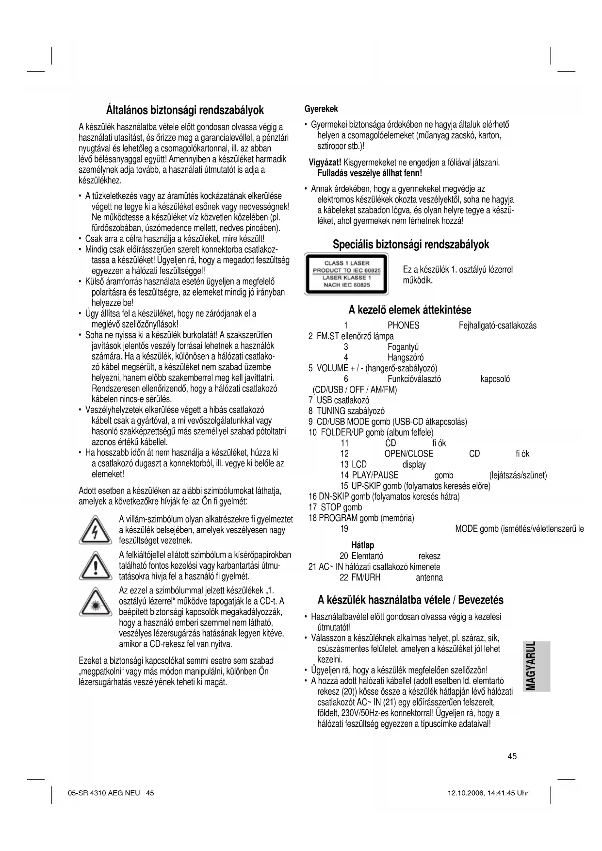 - Külső foltokat, adalékanyag nélküli enyhén nedves ruhával lehet letörölni. Műszaki adatok Modell:............................................................SR 4310 CD/MP3 Feszültségellátás:.................................................. 230 V, 50 Hz Elemmel működik: ........................................6x 1,5 V UM2/R 14 Teljesítményfelvétel: ...........................................................11 W Védelmi osztály:....................................................................... ΙΙ Rádiórész: Frekvenciatartományok:...................... FM 88 ~ 108,0 MHz ....................... AM 540 ~ 1600 kHz Ezt a készüléket az Európa Tanács minden vonatkozó aktuális irányelve szerint (pl. elektromágnesesség-elviselő képesség vagy kisfeszültség-elviselő képesség) ellenőriztük, és a legújabb biztonságtechnikai előírások szerint készült. Megjegyezzük az esetleges müszaki változásokat! Garancia Garanciális igényeivel forduljon, kérem, a szerződéses kereskedőjéhez! A garancia igazolására a pénztári nyugta szolgál. E nélkül az igazolás nélkül sem díjmentes csere, sem díjtalan javítás nem végezhető. Garanciális esetben eredeti csomagolásában adja át az alap- készüléket a pénztári bizonylattal együtt annak a kereskedőnek, akitől a készüléket vásárolta! Sem az elhasználódó tartozékokban, ill. kopó alkatrészekben bekövetkező hibák, sem a tisztítás, karbantartás vagy a kopó alkatrészek cseréje nem esik a garancia hatálya alá, követke- zésképp térítésköteles. Illetéktelen beavatkozás a garancia megszűnését eredményezi. A garanciális idő után A garanciális idő eltelte után a megfelelő szakkereskedésben vagy javítószolgálatnál végeztethet térítésköteles javításokat. A „kuka“ piktogram jelentése Kímélje környezetünket, az elektromos készülékek nem a háztartási szemétbe valók! Használja az elektromos készülékek ártalmatlanítására kijelölt gyűjtőhelyeket, ott adja le azokat az elektromos készülékeit, amelyeket többé már nem kíván használni! Ezzel segítséget nyújt ahhoz, hogy elkerülhetők legyenek azok a hatások, amelyeket a helytelen „szemétre dobás“ gyakorolhat a környezetre és az emberi egészségre. Ezzel hozzájárul az újrahasznosításhoz, a recyclinghoz és a kiöregedett elektromos és elektronikus készülékek értékesítésé- nek egyéb formáihoz. Az önkormányzatoknál vagy a polgármesteri hivatalokban tájékoztatást kaphat arról, hogy hova viheti a kiselejtezett készülékeket. 05-SR 4310 AEG NEU 48 12.10.2006, 14:41:55 UhrMAGYARUL