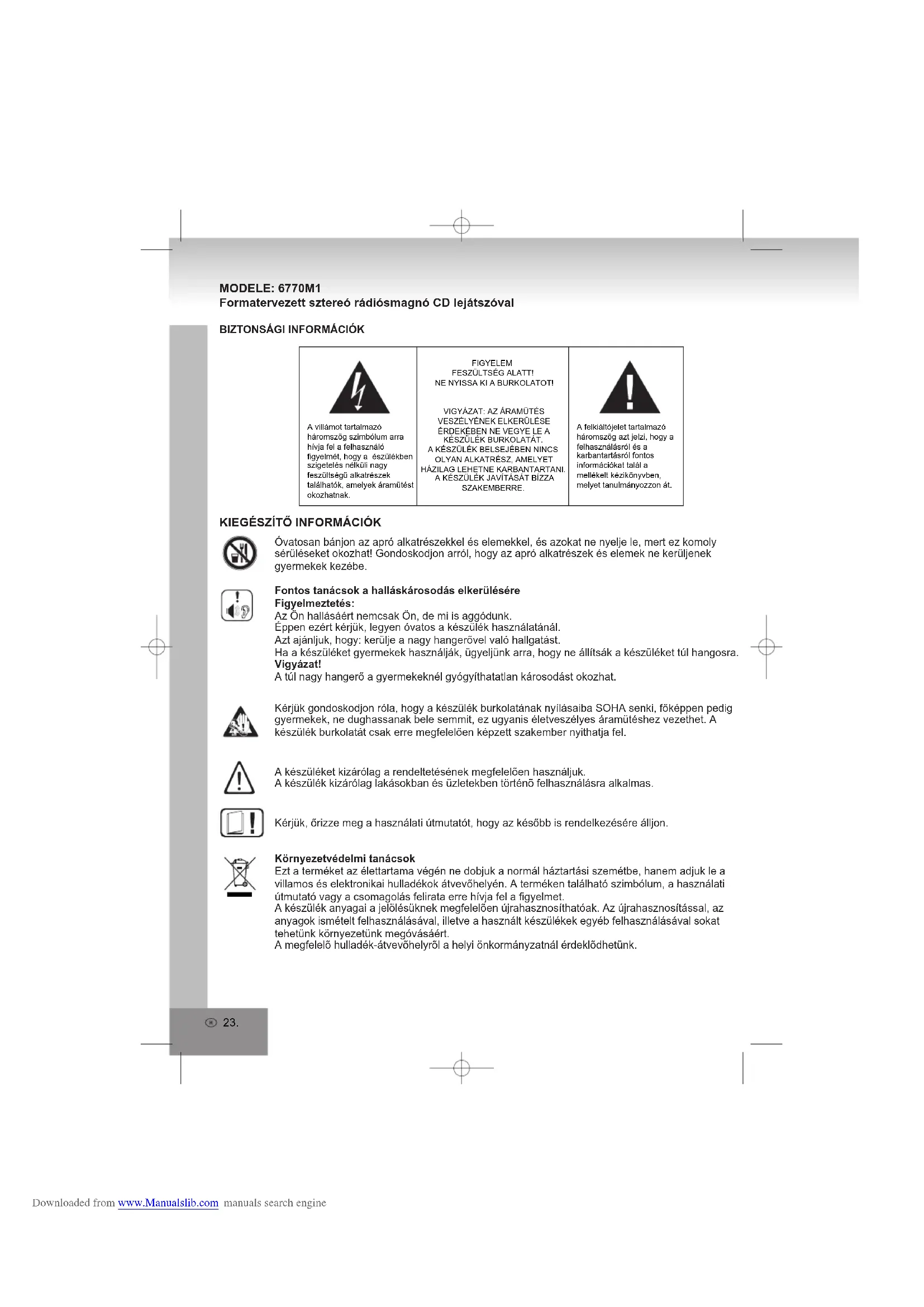 MODELE: 6770M1 Formatervezett sztereó rádiósmagnó CD lejátszóval BIZTONSÁGI INFORMÁCIÓKFIGYELEMFESZÜLTSÉG ALATT!NE NYISSA KI A BURKOLATOT!VIGYÁZAT: AZ ÁRAMÜTÉSVESZÉLYÉNEK ELKERÜLÉSEÉRDEKÉBEN NE VEGYE LE AKÉSZÜLÉK BURKOLATÁT.A KÉSZÜLÉK BELSEJÉBEN NINCSOLYAN ALKATRÉSZ, AMELYETHÁZILAG LEHETNE KARBANTARTANI.A KÉSZÜLÉK JAVÍTÁSÁT BÍZZASZAKEMBERRE.A felkiáltójelet tartalmazóháromszög azt jelzi, hogy afelhasználásról és akarbantartásról fontosinformációkat talál amellékelt kézikönyvben,melyet tanulmányozzon át.A villámot tartalmazó háromszög szimbólum arrahívja fel a felhasználó figyelmét, hogy a észülékben szigetelés nélküli nagy feszültségű alkatrészek találhatók, amelyek áramütéstokozhatnak. Downloaded from www.Manualslib.com manuals search engine24.