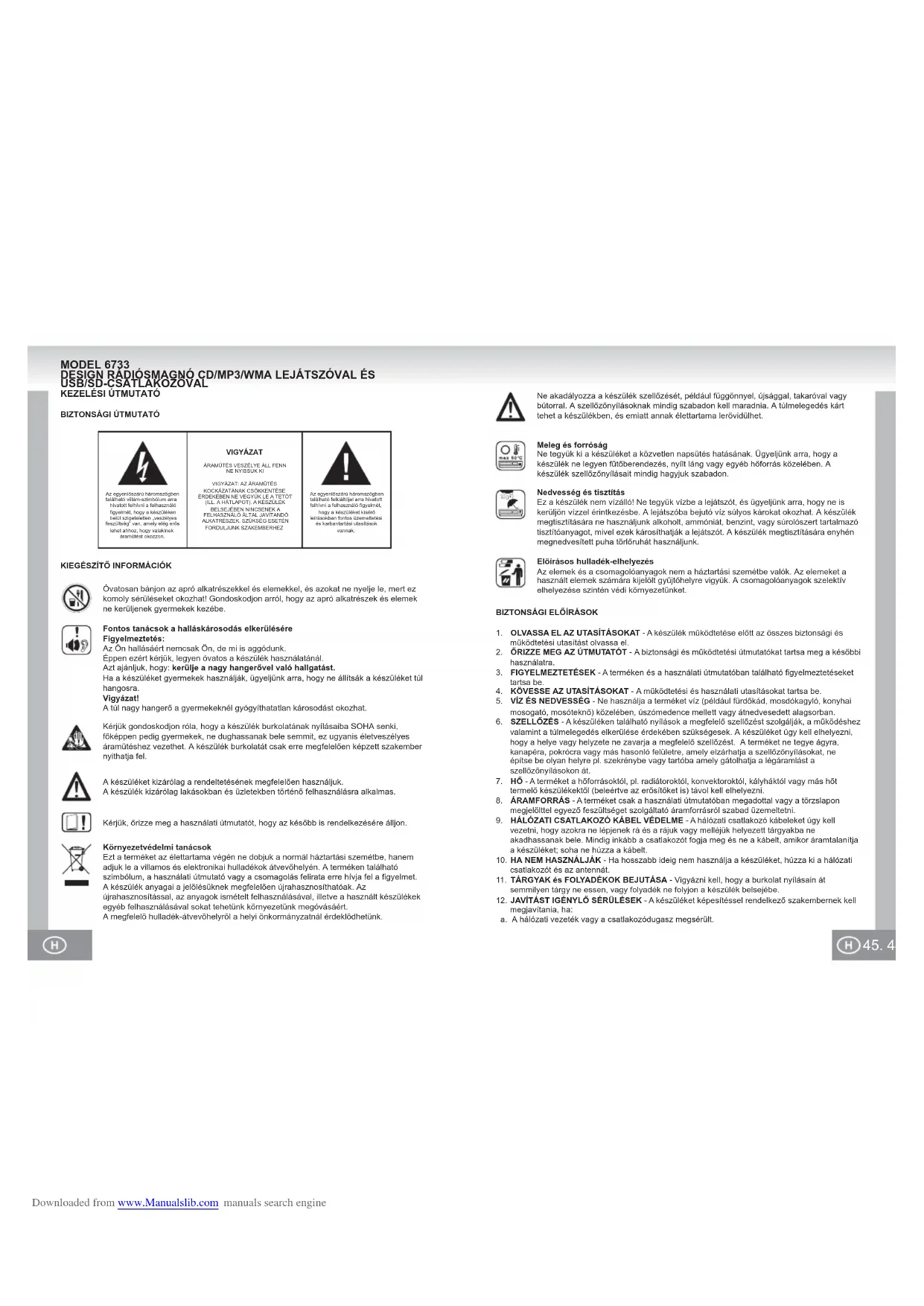 megjavítania, ha: a. A hálózati vezeték vagy a csatlakozódugasz megsérült.Ne akadályozza a készülék szellőzését, például függönnyel, újsággal, takaróval vagy bútorral. A szellőzőnyílásoknak mindig szabadon kell maradnia. A túlmelegedés kárt tehet a készülékben, és emiatt annak élettartama lerövidülhet.Meleg és forróságNe tegyük ki a készüléket a közvetlen napsütés hatásának. Ügyeljünk arra, hogy a készülék ne legyen fűtőberendezés, nyílt láng vagy egyéb hőforrás közelében. A készülék szellőzőnyílásait mindig hagyjuk szabadon.Nedvesség és tisztításEz a készülék nem vízálló! Ne tegyük vízbe a lejátszót, és ügyeljünk arra, hogy ne is kerüljön vízzel érintkezésbe. A lejátszóba bejutó víz súlyos károkat okozhat. A készülék megtisztítására ne használjunk alkoholt, ammóniát, benzint, vagy súrolószert tartalmazó tisztítóanyagot, mivel ezek károsíthatják a lejátszót. A készülék megtisztítására enyhén megnedvesített puha törlőruhát használjunk.Előírásos hulladék-elhelyezésAz elemek és a csomagolóanyagok nem a háztartási szemétbe valók. Az elemeket a használt elemek számára kijelölt gyűjtőhelyre vigyük. A csomagolóanyagok szelektív elhelyezése szintén védi környezetünket. Downloaded from www.Manualslib.com manuals search engine47. 46. b. Folyadék vagy valamilyen tárgy került a készülék belsejébe. c. A készüléket eső vagy víz érte. d. A készüléket leejtették vagy a burkolatot károsodás érte. Csak a kézikönyvben meghatározott kezelőszerveket és beállításokat alkalmazza. e. Az egység a jelek szerint nem működik rendesen. f. A készülék teljesítményében nagymértékű változás állt be.
