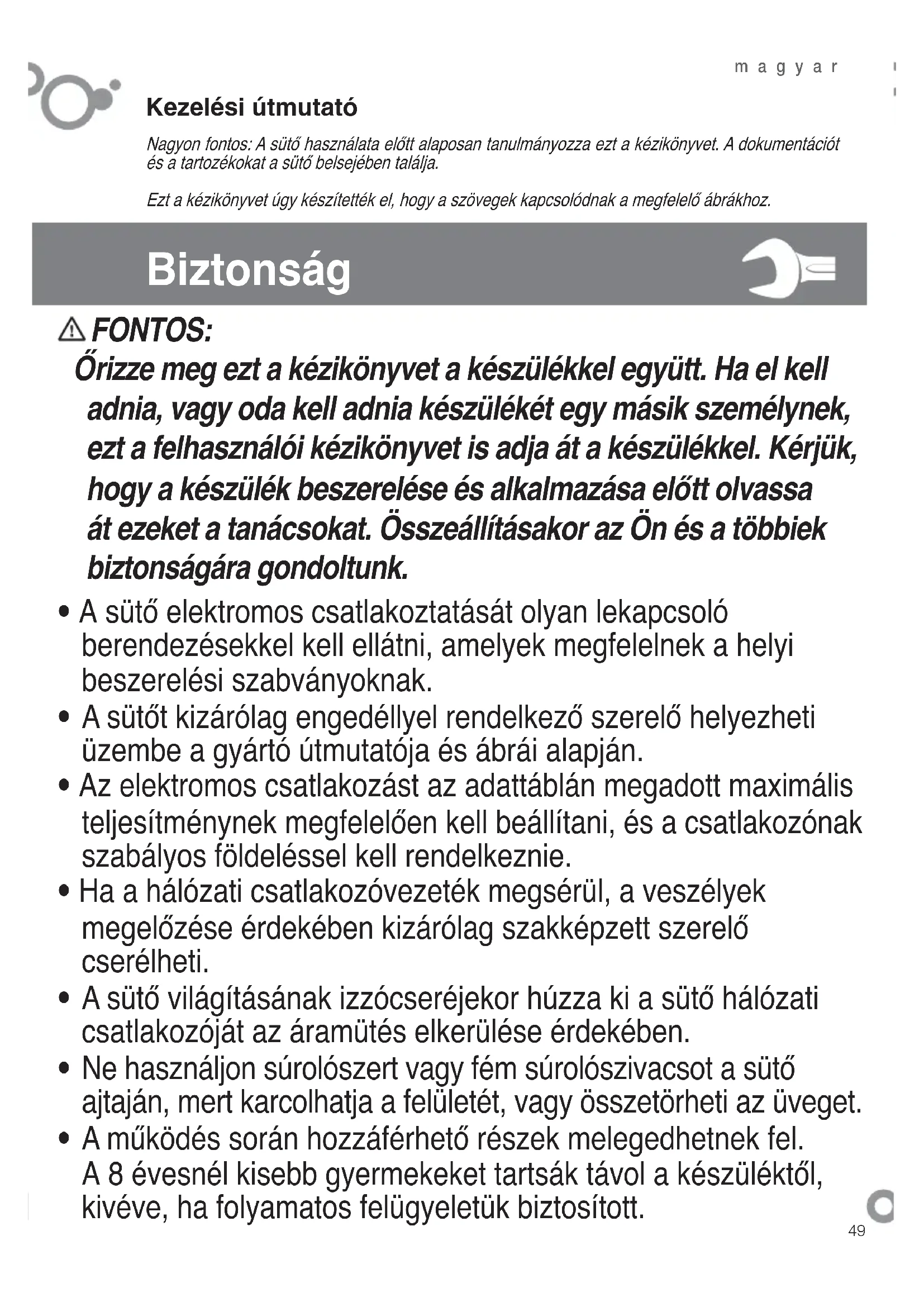 Kezelési útmutató Nagyon fontos: A sütő használata előtt alaposan tanulmányozza ezt a kézikönyvet. A dokumentációt és a tartozékokat a sütő belsejében találja. Ezt a kézikönyvet úgy készítették el, hogy a szövegek kapcsolódnak a megfelelő ábrákhoz. Biztonság
