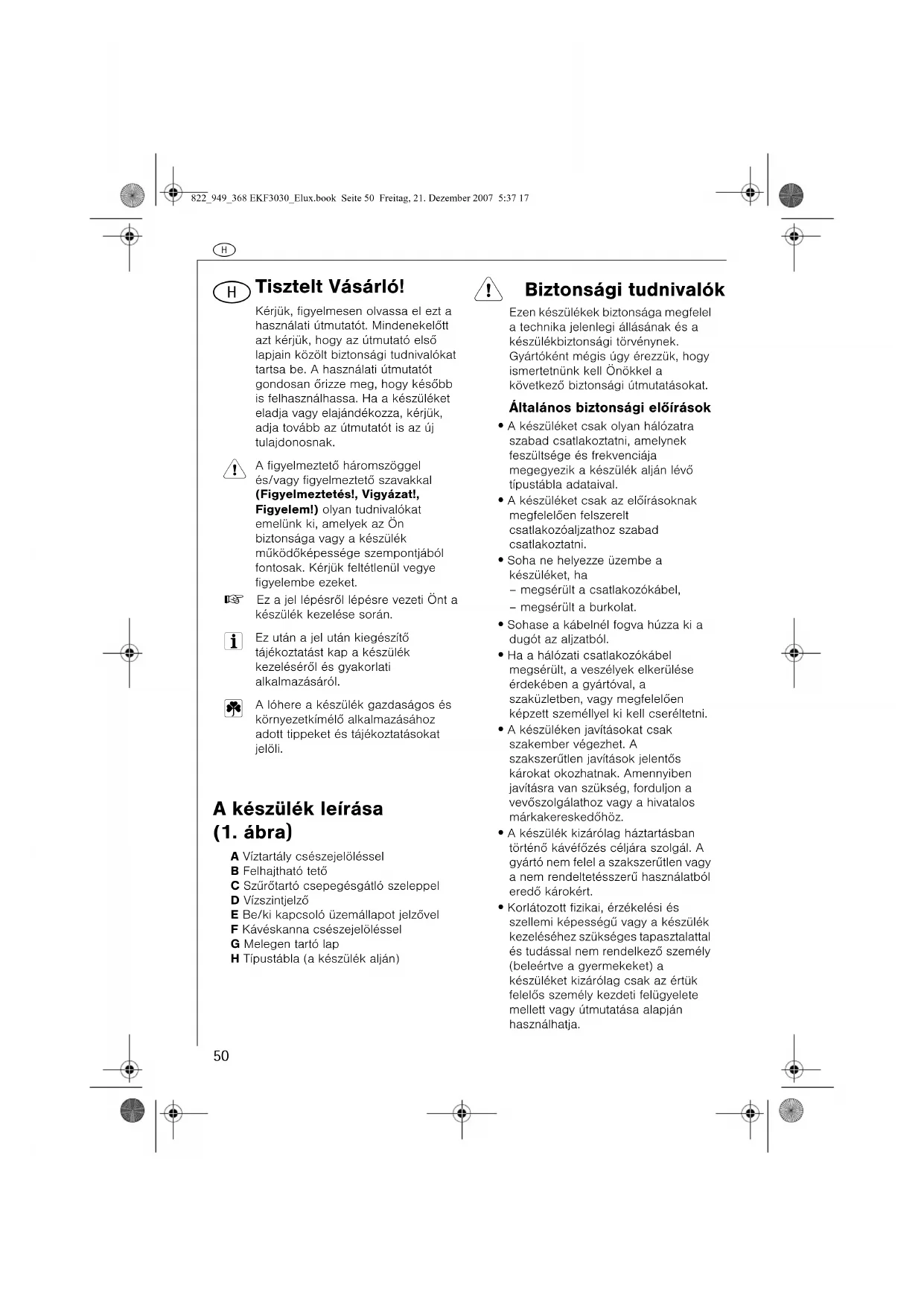 Tisztelt Vásárló! Kérjük, figyelmesen olvassa el ezt a használati útmutatót. Mindenekelõtt azt kérjük, hogy az útmutató elsõ lapjain közölt biztonsági tudnivalókat tartsa be. A használati útmutatót gondosan õrizze meg, hogy késõbb is felhasználhassa. Ha a készüléket eladja vagy elajándékozza, kérjük, adja tovább az útmutatót is az új tulajdonosnak. A figyelmeztetõ háromszöggel és/vagy figyelmeztetõ szavakkal (Figyelmeztetés!, Vigyázat!, Figyelem!) olyan tudnivalókat emelünk ki, amelyek az Ön biztonsága vagy a készülék mûködõképessége szempontjából fontosak. Kérjük feltétlenül vegye figyelembe ezeket.0 Ez a jel lépésrõl lépésre vezeti Önt a készülék kezelése során. Ez után a jel után kiegészítõ tájékoztatást kap a készülék kezelésérõl és gyakorlati alkalmazásáról. A lóhere a készülék gazdaságos és környezetkímélõ alkalmazásához adott tippeket és tájékoztatásokat jelöli. A készülék leírása (1. ábra) A Víztartály csészejelölésselB Felhajtható tetõC Szûrõtartó csepegésgátló szeleppelD VízszintjelzõE Be/ki kapcsoló üzemállapot jelzõvelF Kávéskanna csészejelölésselG Melegen tartó lapH Típustábla (a készülék alján) 1 Biztonsági tudnivalók Ezen készülékek biztonsága megfelel a technika jelenlegi állásának és a készülékbiztonsági törvénynek. Gyártóként mégis úgy érezzük, hogy ismertetnünk kell Önökkel a következõ biztonsági útmutatásokat.Általános biztonsági elõírások• A készüléket csak olyan hálózatra szabad csatlakoztatni, amelynek feszültsége és frekvenciája megegyezik a készülék alján lévõ típustábla adataival.• A készüléket csak az elõírásoknak megfelelõen felszerelt csatlakozóaljzathoz szabad csatlakoztatni.• Soha ne helyezze üzembe a készüléket, ha– megsérült a csatlakozókábel,– megsérült a burkolat.• Sohase a kábelnél fogva húzza ki a dugót az aljzatból.• Ha a hálózati csatlakozókábel megsérült, a veszélyek elkerülése érdekében a gyártóval, a szaküzletben, vagy megfelelõen képzett személlyel ki kell cseréltetni.• A készüléken javításokat csak szakember végezhet. A szakszerûtlen javítások jelentõs károkat okozhatnak. Amennyiben javításra van szükség, forduljon a vevõszolgálathoz vagy a hivatalos márkakereskedõhöz.• A készülék kizárólag háztartásban történõ kávéfõzés céljára szolgál. A gyártó nem felel a szakszerûtlen vagy a nem rendeltetésszerû használatból eredõ károkért.• Korlátozott fizikai, érzékelési és szellemi képességû vagy a készülék kezeléséhez szükséges tapasztalattal és tudással nem rendelkezõ személy (beleértve a gyermekeket) a készüléket kizárólag csak az értük felelõs személy kezdeti felügyelete mellett vagy útmutatása alapján használhatja.822_949_368 EKF3030_Elux.book Seite 50 Freitag, 21. Dezember 2007 5:37 17h