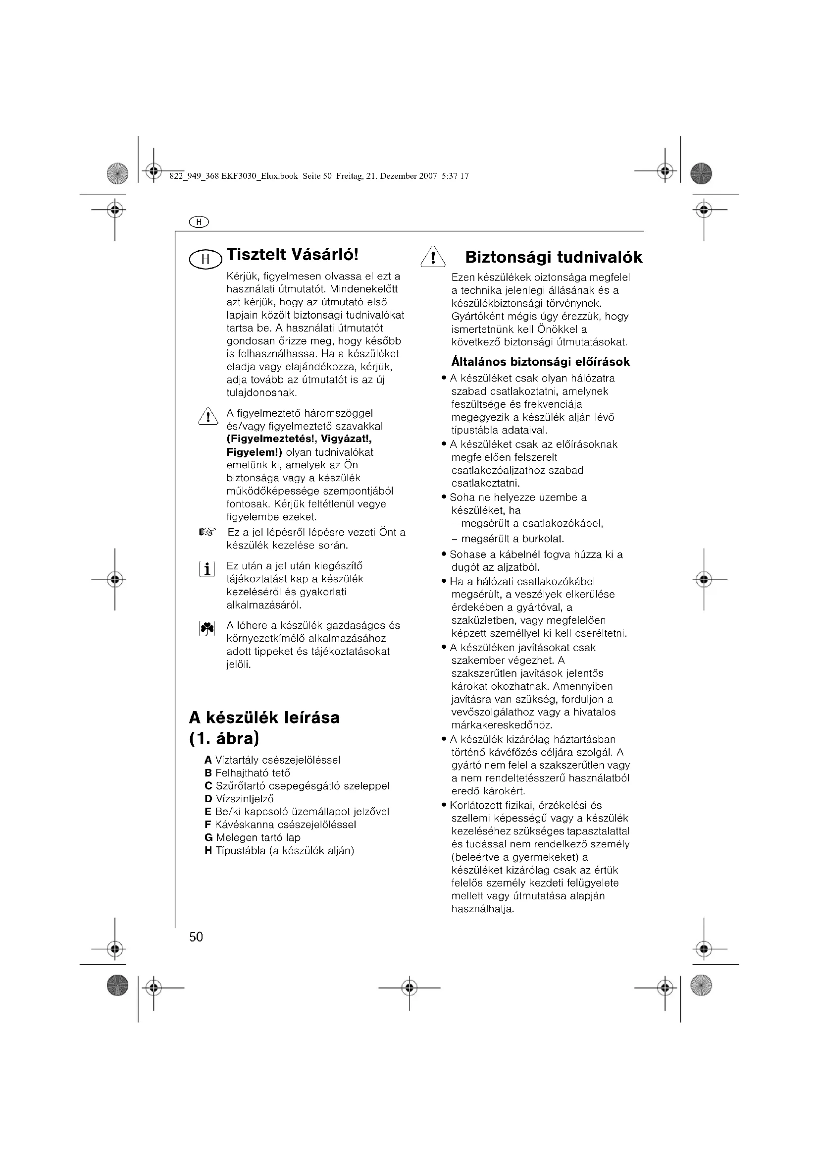 Tisztelt Vásárló! Kérjük, figyelmesen olvassa el ezt a használati útmutatót. Mindenekelõtt azt kérjük, hogy az útmutató elsõ lapjain közölt biztonsági tudnivalókat tartsa be. A használati útmutatót gondosan õrizze meg, hogy késõbb is felhasználhassa. Ha a készüléket eladja vagy elajándékozza, kérjük, adja tovább az útmutatót is az új tulajdonosnak. A figyelmeztetõ háromszöggel és/vagy figyelmeztetõ szavakkal (Figyelmeztetés!, Vigyázat!, Figyelem!) olyan tudnivalókat emelünk ki, amelyek az Ön biztonsága vagy a készülék mûködõképessége szempontjából fontosak. Kérjük feltétlenül vegye figyelembe ezeket.0 Ez a jel lépésrõl lépésre vezeti Önt a készülék kezelése során. Ez után a jel után kiegészítõ tájékoztatást kap a készülék kezelésérõl és gyakorlati alkalmazásáról. A lóhere a készülék gazdaságos és környezetkímélõ alkalmazásához adott tippeket és tájékoztatásokat jelöli. A készülék leírása (1. ábra) A Víztartály csészejelölésselB Felhajtható tetõC Szûrõtartó csepegésgátló szeleppelD VízszintjelzõE Be/ki kapcsoló üzemállapot jelzõvelF Kávéskanna csészejelölésselG Melegen tartó lapH Típustábla (a készülék alján) 1 Biztonsági tudnivalók Ezen készülékek biztonsága megfelel a technika jelenlegi állásának és a készülékbiztonsági törvénynek. Gyártóként mégis úgy érezzük, hogy ismertetnünk kell Önökkel a következõ biztonsági útmutatásokat.Általános biztonsági elõírások• A készüléket csak olyan hálózatra szabad csatlakoztatni, amelynek feszültsége és frekvenciája megegyezik a készülék alján lévõ típustábla adataival.• A készüléket csak az elõírásoknak megfelelõen felszerelt csatlakozóaljzathoz szabad csatlakoztatni.• Soha ne helyezze üzembe a készüléket, ha– megsérült a csatlakozókábel,– megsérült a burkolat.• Sohase a kábelnél fogva húzza ki a dugót az aljzatból.• Ha a hálózati csatlakozókábel megsérült, a veszélyek elkerülése érdekében a gyártóval, a szaküzletben, vagy megfelelõen képzett személlyel ki kell cseréltetni.• A készüléken javításokat csak szakember végezhet. A szakszerûtlen javítások jelentõs károkat okozhatnak. Amennyiben javításra van szükség, forduljon a vevõszolgálathoz vagy a hivatalos márkakereskedõhöz.• A készülék kizárólag háztartásban történõ kávéfõzés céljára szolgál. A gyártó nem felel a szakszerûtlen vagy a nem rendeltetésszerû használatból eredõ károkért.• Korlátozott fizikai, érzékelési és szellemi képességû vagy a készülék kezeléséhez szükséges tapasztalattal és tudással nem rendelkezõ személy (beleértve a gyermekeket) a készüléket kizárólag csak az értük felelõs személy kezdeti felügyelete mellett vagy útmutatása alapján használhatja.822_949_368 EKF3030_Elux.book Seite 50 Freitag, 21. Dezember 2007 5:37 17h