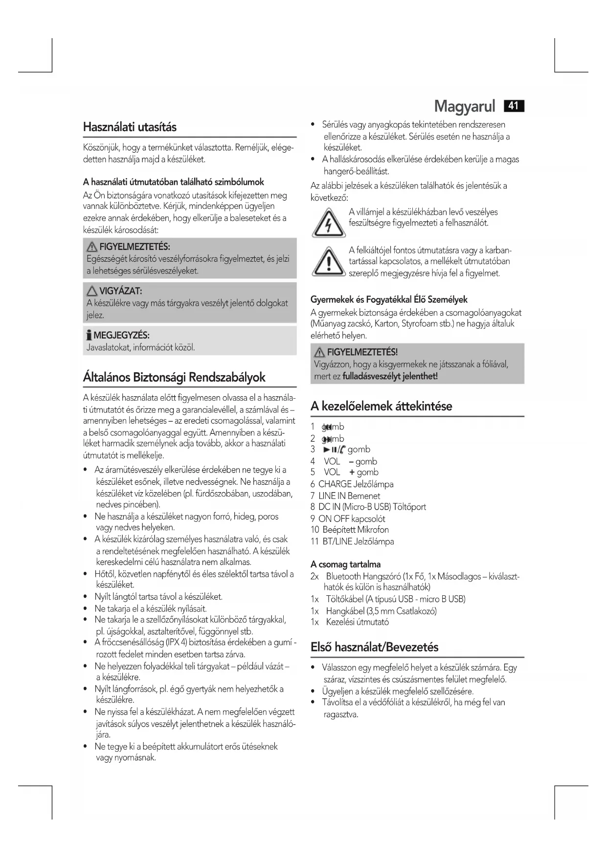 gomb 4 VOL – gomb 5 VOL + gomb 6 CHARGE Jelzőlámpa 7 LINE IN Bemenet 8 DC IN (Micro-B USB) Töltőport 9 ON OFF kapcsolót 10 Beépített Mikrofon 11 BT/LINE Jelzőlámpa A csomag tartalma 2x BluetoothHangszóró(1xFő,1xMásodlagos–kiválaszt- hatók és külön is használhatók) 1x Töltőkábel(AtípusúUSB-microBUSB) 1x Hangkábel(3,5mmCsatlakozó) 1x Kezelésiútmutató Első használat/Bevezetés