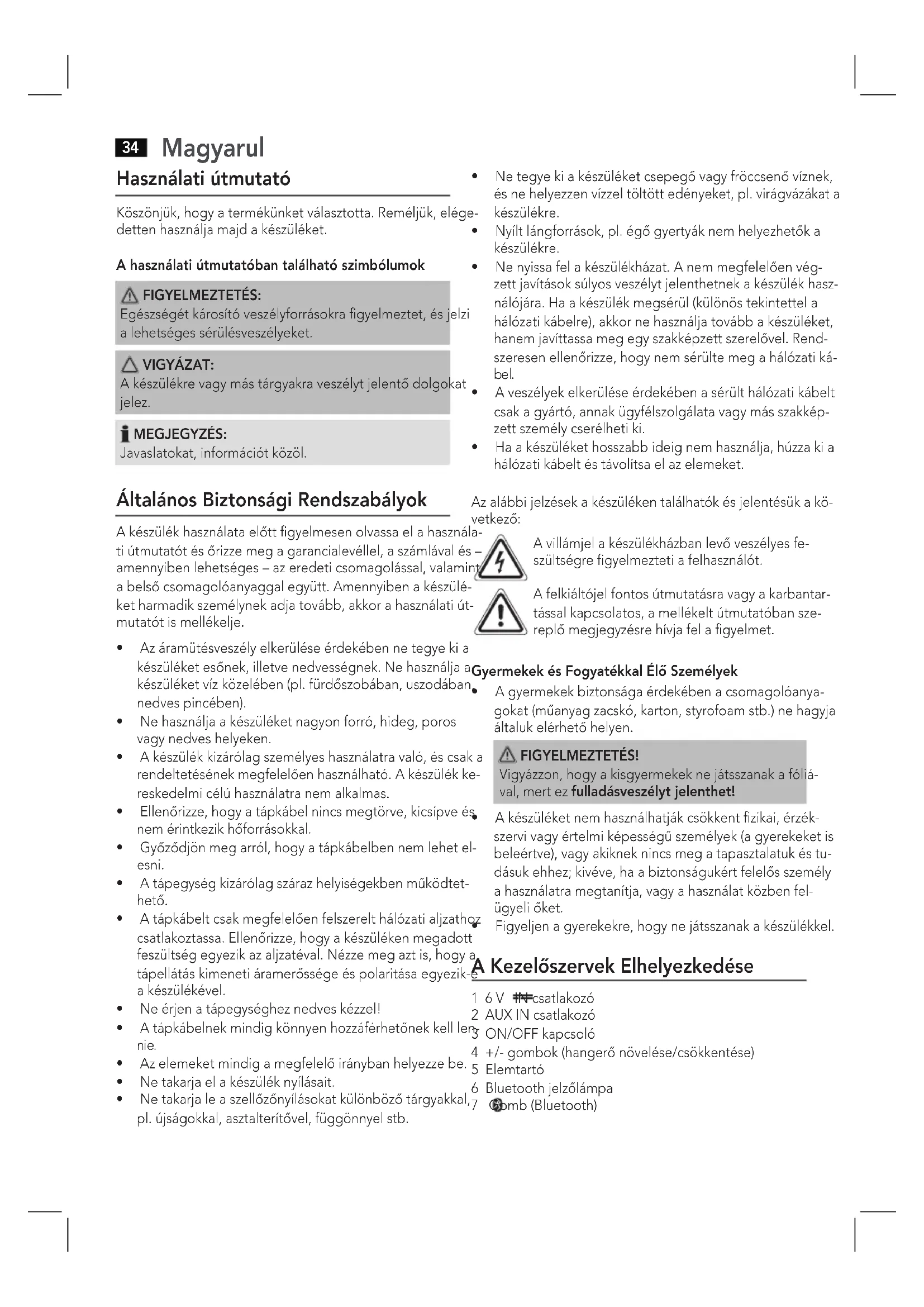 Az aramutésveszély elkerülèse érdekében ne tegye ki a készüléket esonek, illetve nedvességnek. Ne használa ja készüléket viz közelében (pl. furdǒszobában, uzodában, nedves pincében).
