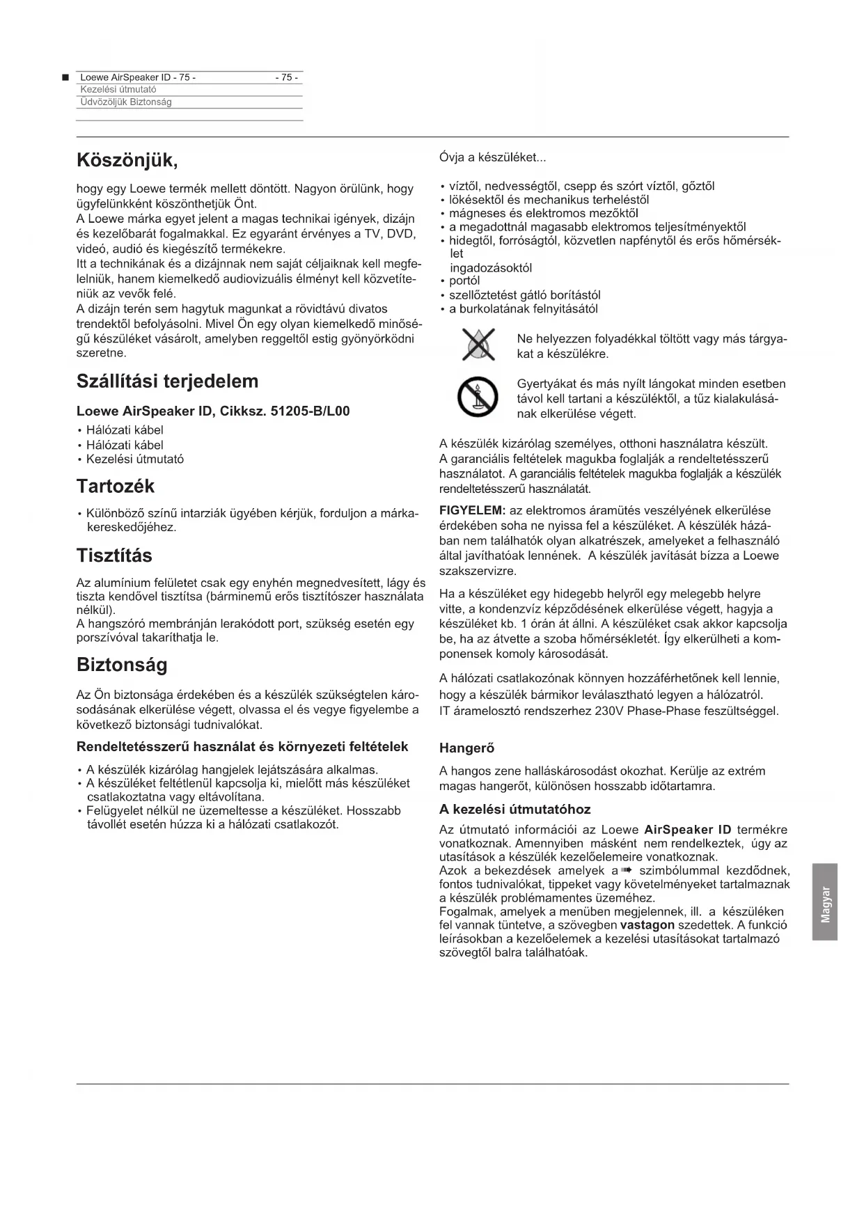 - 75 -Kezelési útmutatóÜdvözöljük Biztonság Köszönjük, hogy egy Loewe termék mellett döntött. Nagyon örülünk, hogy ügyfelünkként köszönthetjük Önt. A Loewe márka egyet jelent a magas technikai igények, dizájn és kezelőbarát fogalmakkal. Ez egyaránt érvényes a TV, DVD, videó, audió és kiegészítő termékekre. Itt a technikának és a dizájnnak nem saját céljaiknak kell megfe- lelniük, hanem kiemelkedő audiovizuális élményt kell közvetíte- niük az vevők felé. A dizájn terén sem hagytuk magunkat a rövidtávú divatos trendektől befolyásolni. Mivel Ön egy olyan kiemelkedő minősé- gű készüléket vásárolt, amelyben reggeltől estig gyönyörködni szeretne. Szállítási terjedelem Loewe AirSpeaker ID, Cikksz. 51205-B/L00