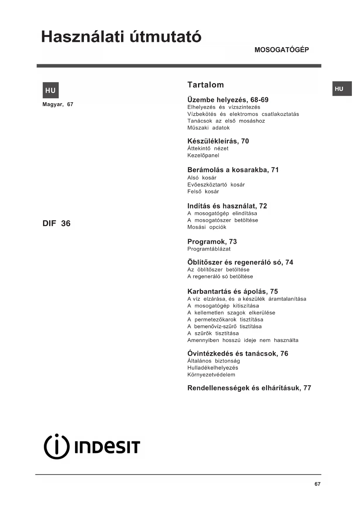 HASZNÁLATI ÚTMUTATÓ DIF 36 G INDESIT