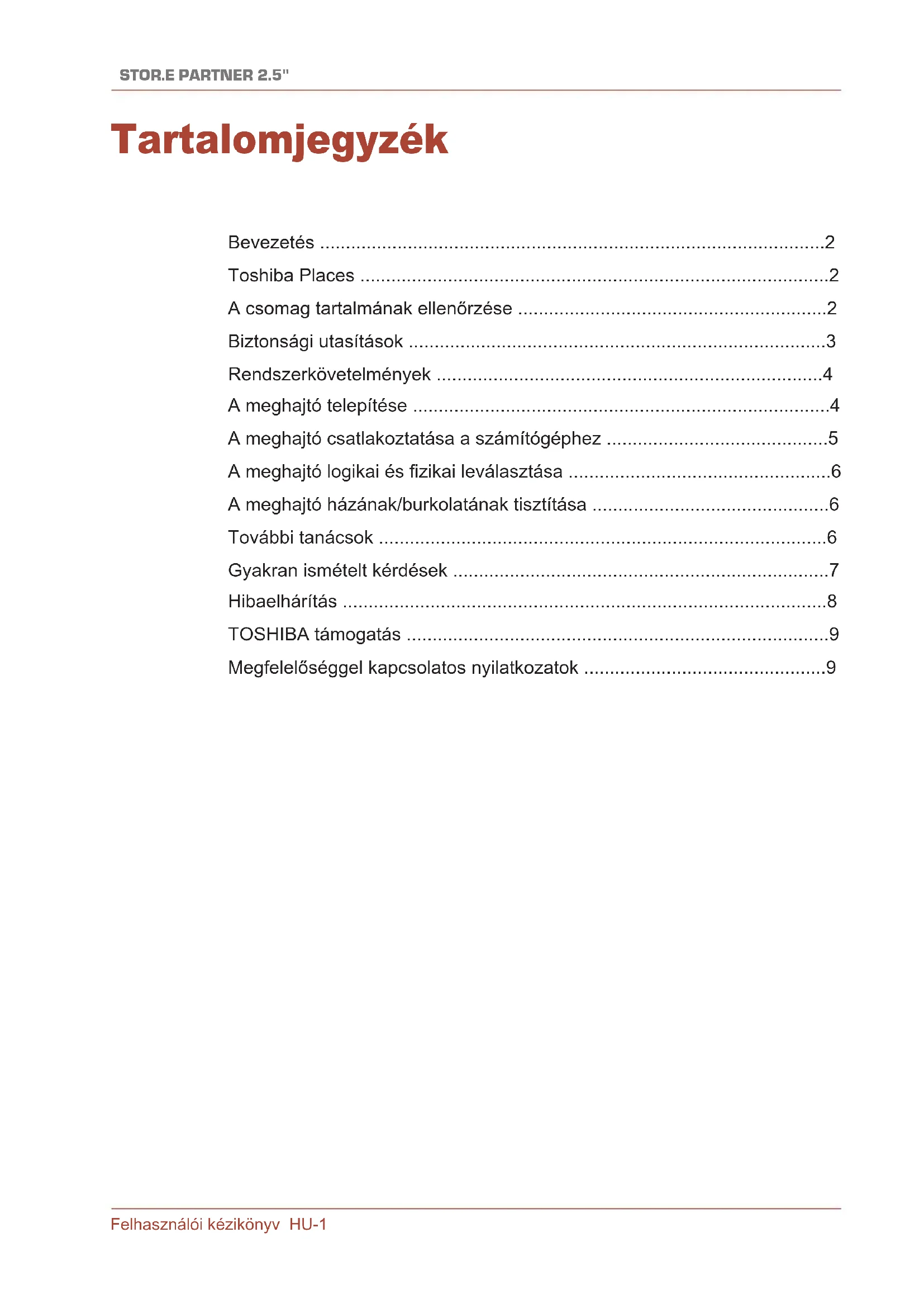 Bevezetés Köszönjük, hogy a TOSHIBA STOR.E PARTNER 2.5" merevlemez- meghajtót választotta. Kérjük, gyelmesen olvassa el ezt a felhasználói kézikönyvet, mivel minden fontos tudnivaló megtalálható benne a meghajtó telepítésével, használatával és karbantartásával kapcsolatban, és biztonsági tanácsokkal is szolgál. Ha az eszköz nem a várakozásnak megfelelően viselkedik, akkor lapozza fel a „Gyakori kérdések” című részt a kézikönyv végén. Toshiba Places A Toshiba Places kényelmes lehetőséget biztosít, hogy a böngéssze, elérje és megvásárolja a zenéket, videókat és más tartalmakat, és élvezze azokat a számítógépén*. Csak menjen a www.toshibaplaces.com weboldalra, és élvezze a tartalmat! *A tartalom a tartózkodási helytől függ. A csomag tartalmának ellenőrzése Warranty Card