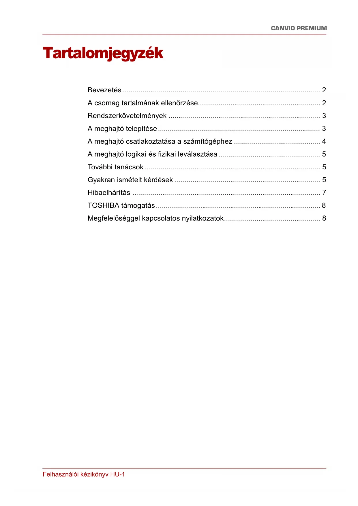 - Megfelelőséggel kapcsolatos nyilatkozatok Felhasználói kézikönyv HU-2 CANVIO PREMIUM Bevezetés Köszönjük, hogy a TOSHIBA Canvio Premium merevlemez-meghajtót választotta. Figyelmesen olvassa el ezt a felhasználói kézikönyvet, mivel minden fontos tudnivaló megtalálható benne a meghajtó telepítésével, használatával és karbantartásával kapcsolatban, valamint biztonsági tanácsokkal is szolgál. Ha az eszköz nem a várakozásnak megfelelően viselkedik, akkor lapozza fel a „Gyakori kérdések” című részt a kézikönyv végén. A csomag tartalmának ellenőrzése A jelen felhasználói kézikönyv fel van töltve a meghajtóra. Javasoljuk, hogy a meghajtó telepítése után azonnal készítsen a felhasználói kézikönyvről biztonsági másolatot egy CD lemezre vagy a helyi meghajtóra. Olvassa el a külső merevlemez-meghajtóra feltöltött „Biztonsági és kényelmi utasítások kézikönyve” című dokumentumot. Canvio Premium (tartalmazza a következő dokumentumokat: Felhasználói kézikönyv, Biztonsági és kényelmi utasítások kézikönyve) USB 3.0-s mikro-B kábel Tok C-típusú USB-adapter Támogatási dokumentumFelhasználói kézikönyv HU-3 CANVIO PREMIUM Rendszerkövetelmények ■ Windows p. 8