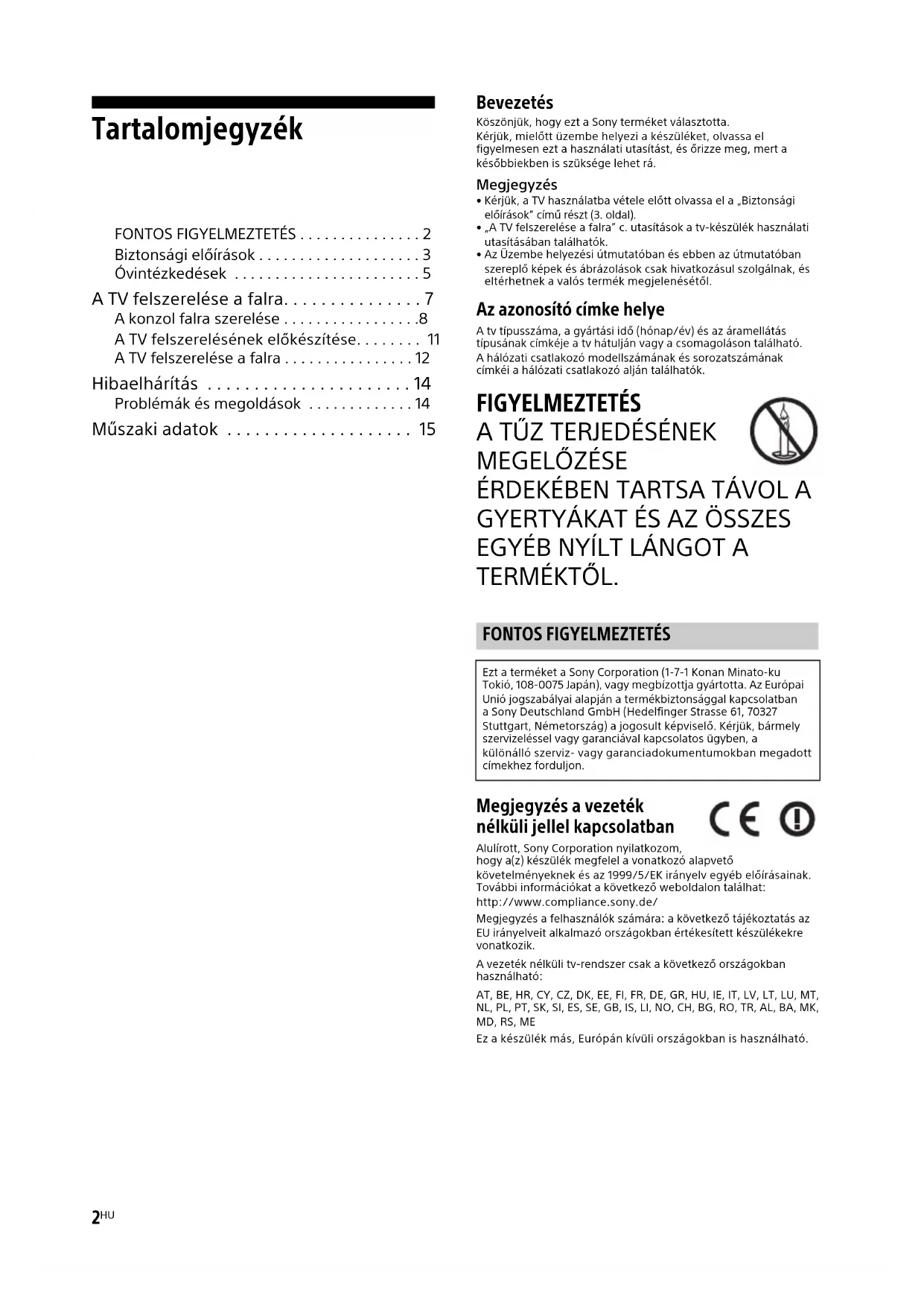 - Műszaki adatok Bevezetés Köszönjük, hogy ezt a Sony terméket választotta. Kérjük, mielőtt üzembe helyezi a készüléket, olvassa el figyelmesen ezt a használati utasítást, és őrizze meg, mert a későbbiekben is szüksége lehet rá.Megjegyzés• Kérjük, a TV használatba vétele előtt olvassa el a „Biztonsági előírások” című részt (3. oldal). • „A TV felszerelése a falra” c. utasítások a tv-készülék használati utasításában találhatók.• Az Üzembe helyezési útmutatóban és ebben az útmutatóban szereplő képek és ábrázolások csak hivatkozásul szolgálnak, és eltérhetnek a valós termék megjelenésétől. Az azonosító címke helye A tv típusszáma, a gyártási idő (hónap/év) és az áramellátás típusának címkéje a tv hátulján vagy a csomagoláson található. A hálózati csatlakozó modellszámának és sorozatszámának címkéi a hálózati csatlakozó alján találhatók. FIGYELMEZTETÉS p. 15