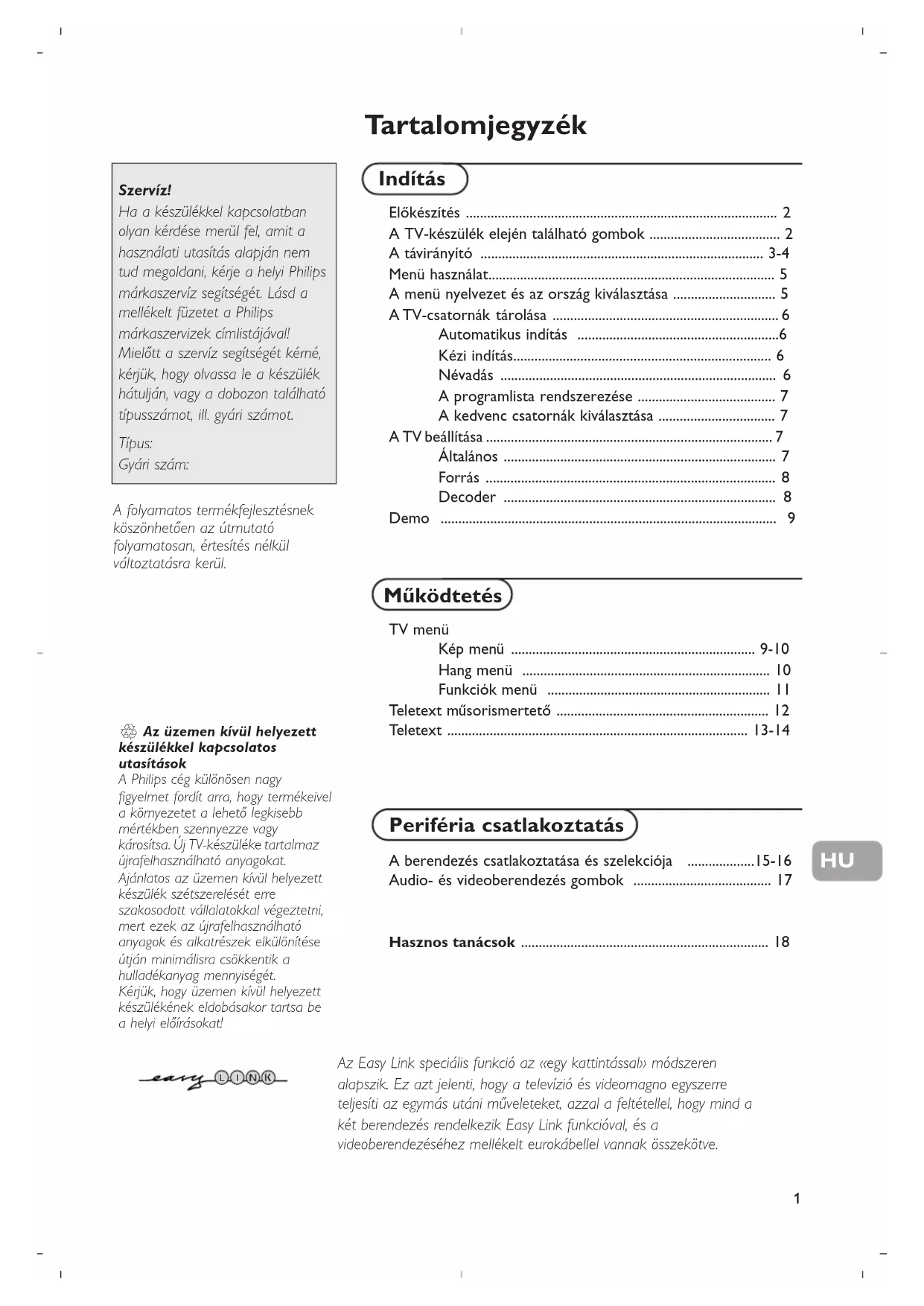 - Ó·ÌÔÓ‹˜ ·Ó·ÌÔÓ‹˜. ∏ ηٷӿψÛË ÂÓ¤ÚÁÂÈ·˜ Û˘Ì‚¿ÏÏÂÈ ÛÙË ÌfiÏ˘ÓÛË ÙÔ˘ ·¤Ú· Î·È ÙÔ˘ ÓÂÚÔ‡. ∫·Ù·Ó¿ÏˆÛË ÈÛ¯‡Ô˜ : 1 W.1 Ta r talomjegyzék Előkészítés ........................................................................................ 2 A TV-készülék elején található gombok ..................................... 2 A távirányító ................................................................................ 3-4 Menü használat................................................................................. 5 A menü nyelvezet és az ország kiválasztása ............................. 5 A TV-csatornák tárolása ................................................................ 6 Automatikus indítás .........................................................6 Kézi indítás......................................................................... 6 Névadás .............................................................................. 6 A programlista rendszerezése ....................................... 7 A kedvenc csatornák kiválasztása ................................. 7 A TV beállítása ................................................................................. 7 Általános ............................................................................. 7 Forrás .................................................................................. 8 Decoder ............................................................................. 8 Demo ............................................................................................... 9 Indítás TV menü Kép menü ..................................................................... 9-10 Hang menü ...................................................................... 10 Funkciók menü ............................................................... 11 Teletext műsorismertető ............................................................ 12 Teletext ..................................................................................... 13-14 Periféria csatlakoztatás A berendezés csatlakoztatása és szelekciója ...................15-16 Audio- és videoberendezés gombok ....................................... 17 Hasznos tanácsok ...................................................................... 18 Működtetés Az Easy Link speciális funkció az «egy kattintással» módszeren alapszik. Ez azt jelenti, hogy a televízió és videomagno egyszerre teljesíti az egymás utáni műveleteket, azzal a feltétellel, hogy mind a két berendezés rendelkezik Easy Link funkcióval, és a videoberendezéséhez mellékelt eurokábellel vannak összekötve. R Az üzemen kívül helyezett készülékkel kapcsolatos utasítások A Philips cég különösen nagy figyelmet fordít arra, hogy termékeivel a környezetet a lehető legkisebb mértékben szennyezze vagy károsítsa. Új TV-készüléke tartalmaz újrafelhasználható anyagokat. Ajánlatos az üzemen kívül helyezett készülék szétszerelését erre szakosodott vállalatokkal végeztetni, mert ezek az újrafelhasználható anyagok és alkatrészek elkülönítése útján minimálisra csökkentik a hulladékanyag mennyiségét. Kérjük, hogy üzemen kívül helyezett készülékének eldobásakor tartsa be a helyi előírásokat! Szervíz! Ha a készülékkel kapcsolatban olyan kérdése merül fel, amit a használati utasítás alapján nem tud megoldani, kérje a helyi Philips márkaszervíz segítségét. Lásd a mellékelt füzetet a Philips márkaszervizek címlistájával! Mielőtt a szervíz segítségét kérné, kérjük, hogy olvassa le a készülék hátulján, vagy a dobozon található típusszámot, ill. gyári számot. Típus: Gyári szám: A folyamatos termékfejlesztésnek köszönhetően az útmutató folyamatosan, értesítés nélkül változtatásra kerül. HU2 & Helyezze szilárd, stabil felületre a TV-t. A megfelelő szellőzés biztosítása érdekében hagyjon szabadon legalább 5 cm-t a készülék minden oldalánál. Ne tegye a tv-készüléket szőnyegre. Balesetveszély elkerülése érdekében kérjük, hogy semmit se helyezzen a készülék tetejére. Készüléke elhelyezésére hőtől, közvetlen napfénytől, esőtől és egyéb nedvességtől védett helyet válasszon. é Illessze az antenna dugós csatlakozóját a készülék hátsó oldalán található antennahüvelybe x! “ Illessze a hálózati csatlakozódugót 220V-240V feszültségű fali konnektorba! ‘ Távirányítás:Helyezze el a csomagolásban található két elemet (R6 típus 1,5V)! A készülékhez biztosított elemek nem tartalmaznak higanyt és kadmiumot (nehéz fémek). Számos országban azonban még az ilyen elemeket is tilos a háztartási hulladékkal együtt kidobni. Ajánlatos tehát lakóhelyén felvilágosítást kérni a helyi előírásokkal kapcsolatban. ( Kapcsolja be a TV-t: nyomja meg a standby gombot A, ami a TV készülék elején található. A TV készülék elején található kontrollampa kigyullad és a képernyő is bekapcsolódik. Ha a készülék standby módban van, azaz ég a piros kontrollámpa, nyomja meg a -P+ vagy B gombokat a távirányítón. Előkészítés