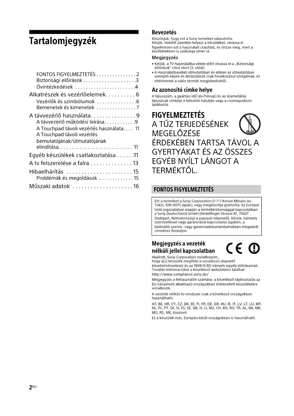 - Műszaki adatok Bevezetés Köszönjük, hogy ezt a Sony terméket választotta. Kérjük, mielőtt üzembe helyezi a készüléket, olvassa el figyelmesen ezt a használati utasítást, és őrizze meg, mert a későbbiekben is szüksége lehet rá.Megjegyzés• Kérjük, a TV használatba vétele előtt olvassa el a „Biztonsági előírások” című részt (3. oldal). p. 16