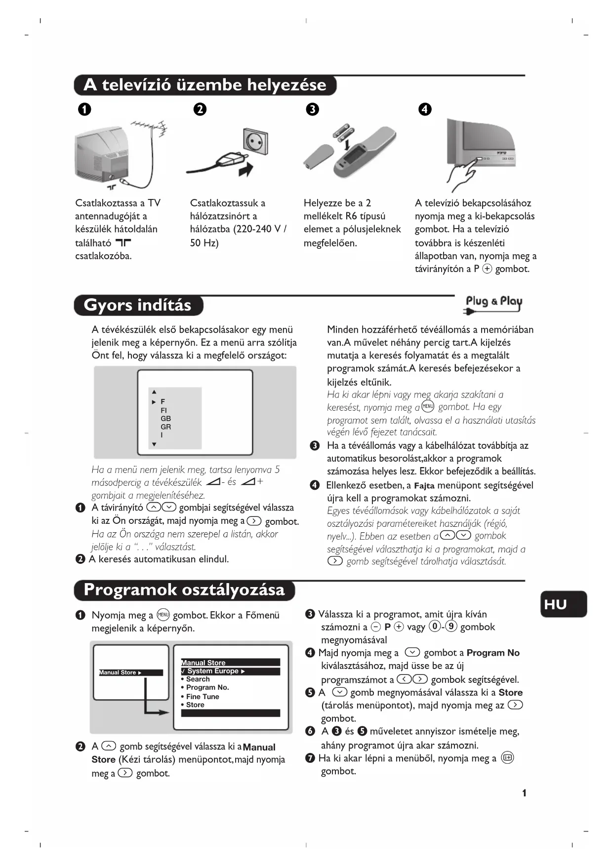 csatlakozóba. Csatlakoztassuk a hálózatzsinórt a hálózatba (220-240 V / 50 Hz) Helyezze be a 2 mellékelt R6 típusú elemet a pólusjeleknek megfelelően. A televízió bekapcsolásához nyomja meg a ki-bekapcsolás gombot. Ha a televízió továbbra is készenléti állapotban van, nyomja meg a távirányítón a P # gombot. æÂê® Gyors indítás Programok osztályozása A tévékészülék első bekapcsolásakor egy menü jelenik meg a képernyőn. Ez a menü arra szólítja Önt fel, hogy válassza ki a megfelelő országot: Ha a menü nem jelenik meg, tartsa lenyomva 5 másodpercig a tévékészülék ”- és ”+ gombjait a megjelenítéséhez.